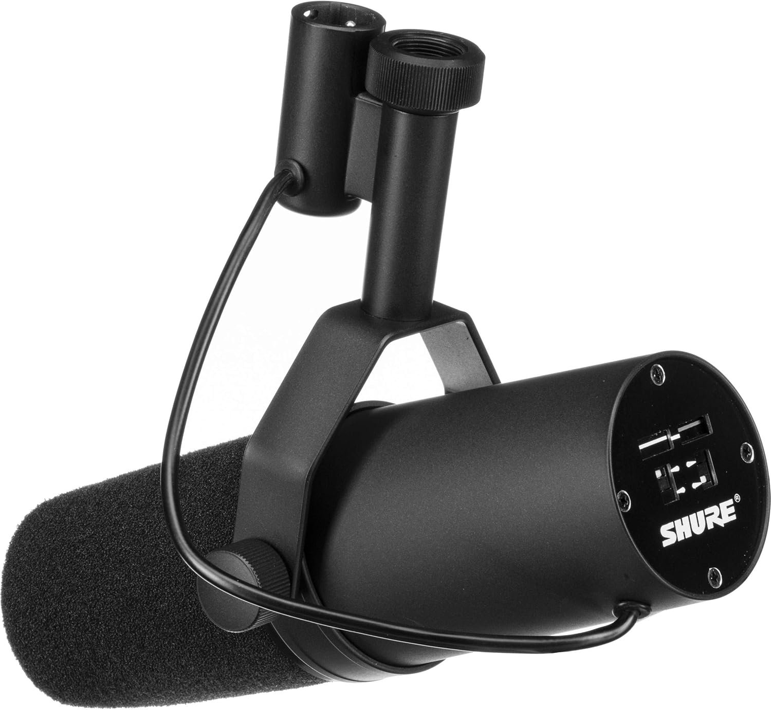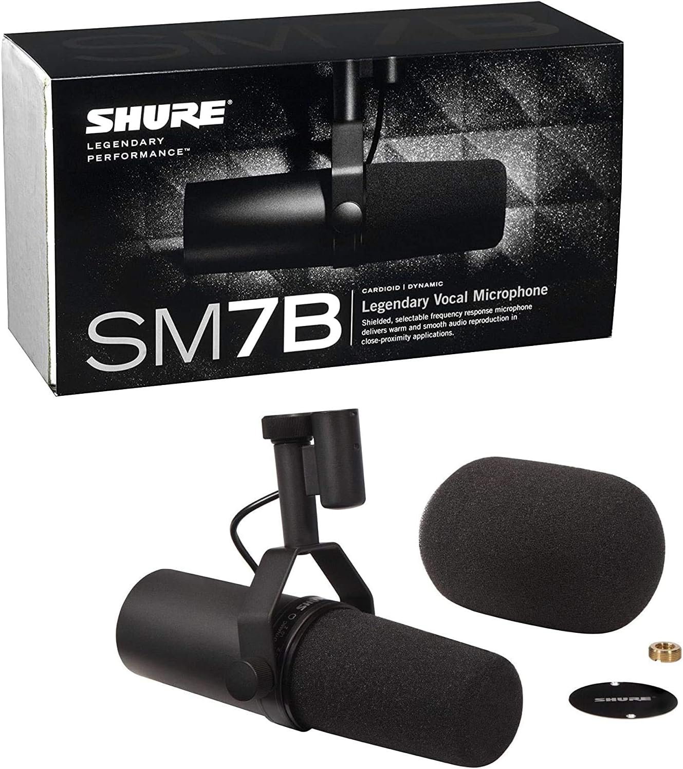 The Shure SM7B Vocal Microphone is a dynamic microphone with a smooth, flat, wide-range frequency response appropriate for music and speech in all professional audio applications. It features a cardioid polar pattern, bass roll-off and midrange emphasis (presence boost) controls, and shielding against broadband interference. An internal air suspension shock isolation helps to eliminate mechanical noise transmission and a yoke mount facilitates mounting and provides precise control of the mic position.