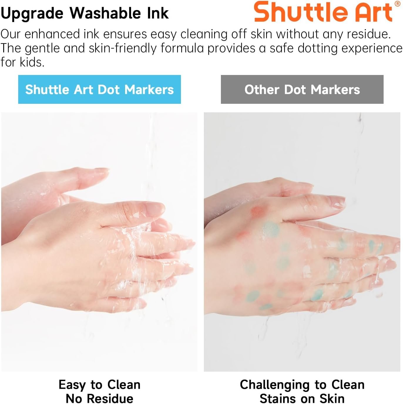FIT FOR SMALL FINGERS: Featuring 0.42 oz bottles, Shuttle Art dot markers are lightweight and easy for toddlers to grip. Designed to fit small hands, these markers are effortless for kids to hold, mix, and blend colors to create their masterpieces