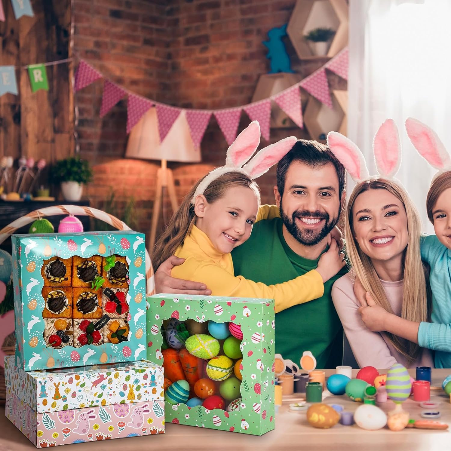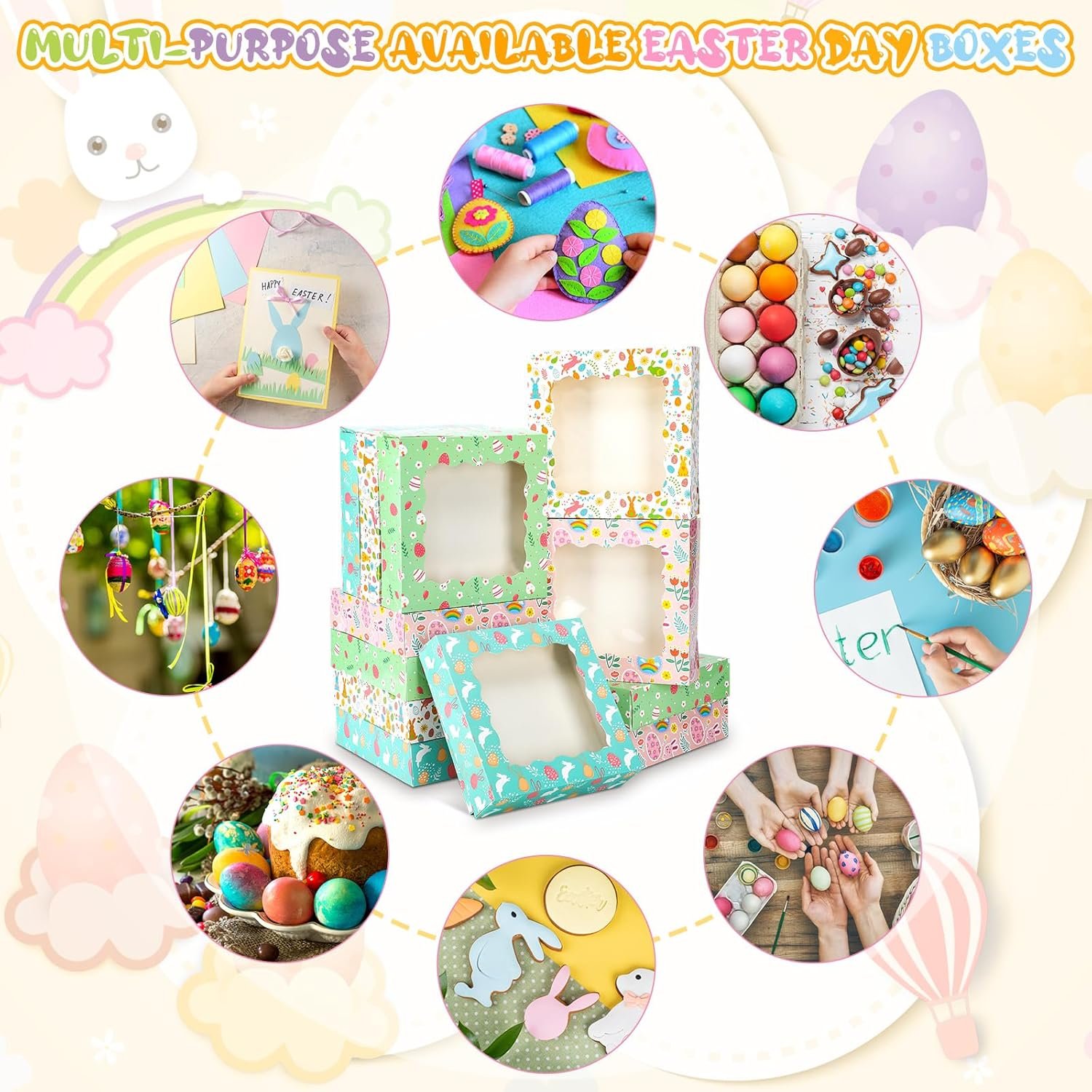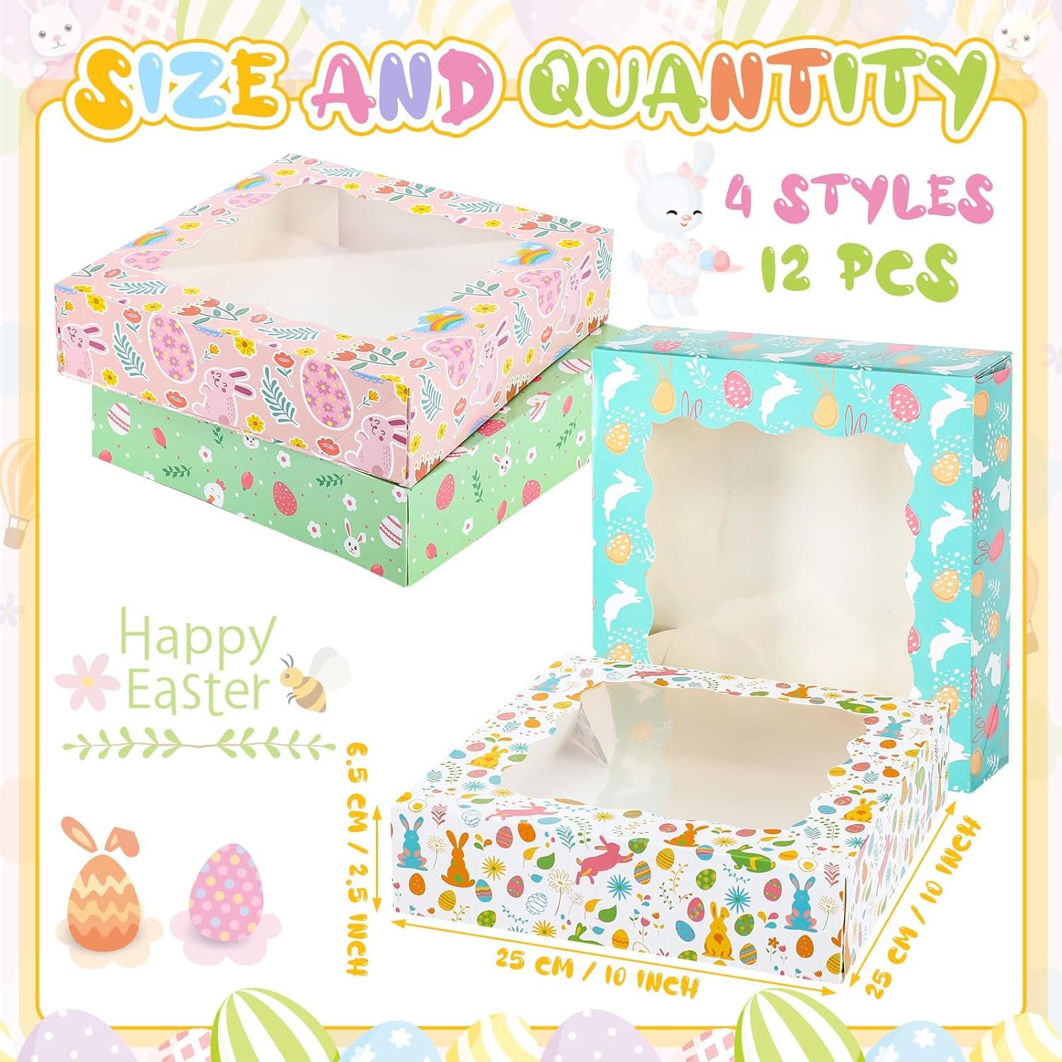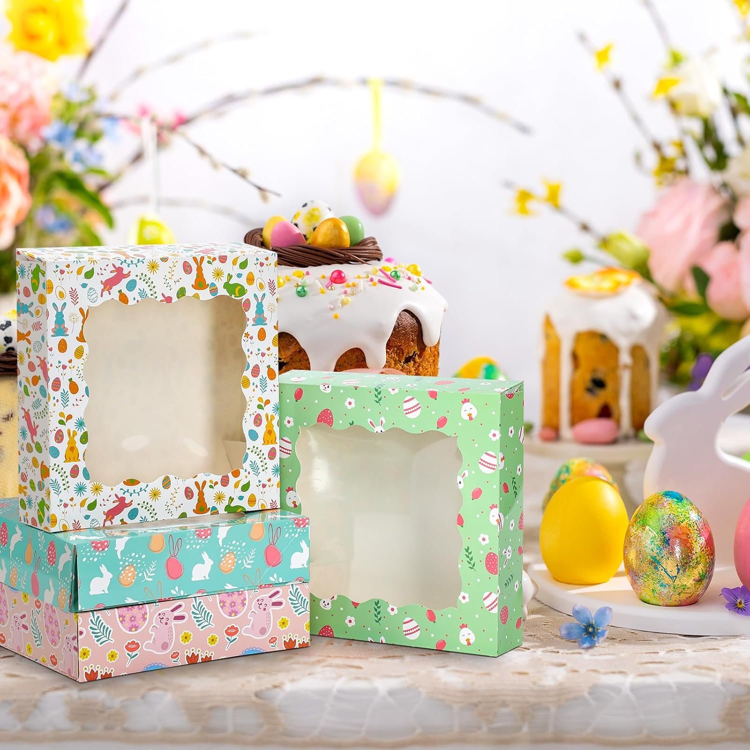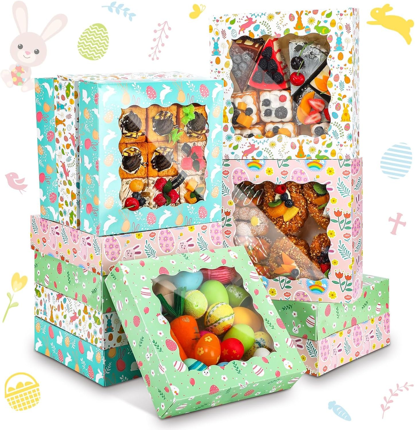 Sturdy Materials: the Easter Day bakery boxes with window are crafted from sturdy cardboard that ensures durability; The carefully chosen materials enhance the longevity of the boxes, ensuring they remain intact even when filled with the desserts