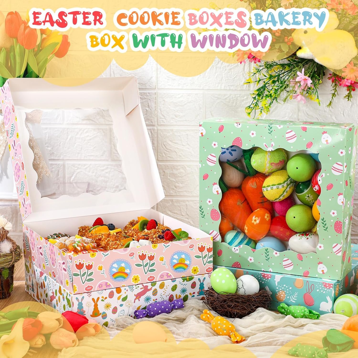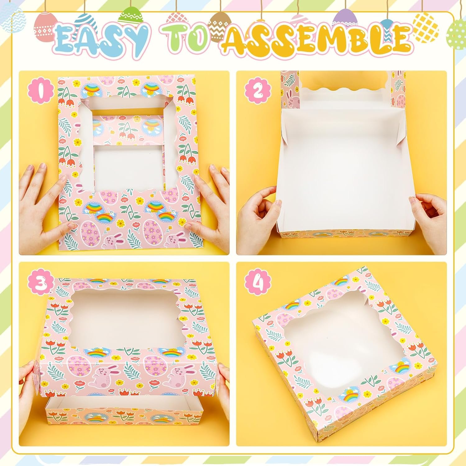 Easy to Use and Versatile: not just attractive, these Easter Day pastry boxes with window are foldable, making them easy to use, and you can refer to our folding step by step diagram to assemble them in a short time, which can be flattened and stored away when not in use, saving you precious storage space