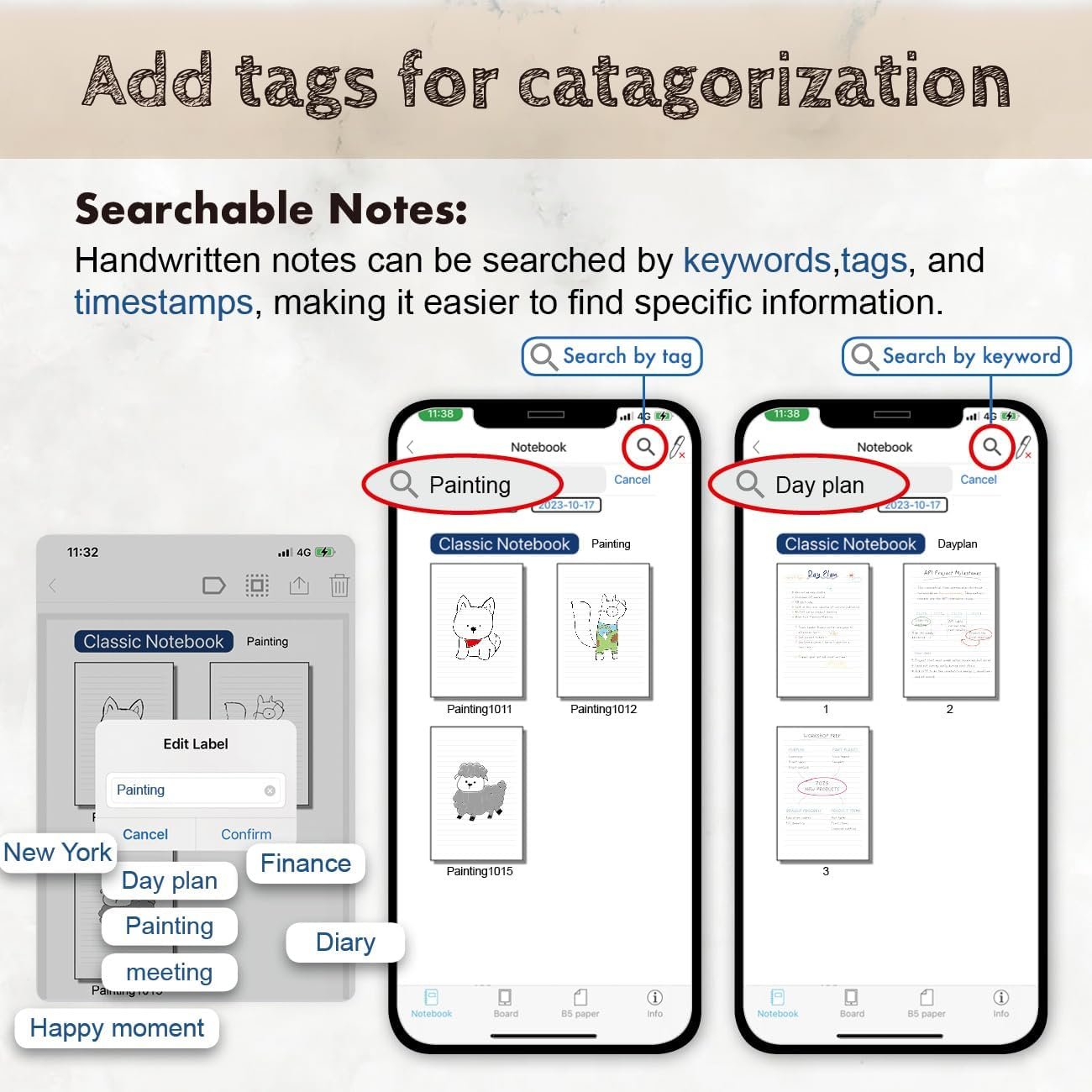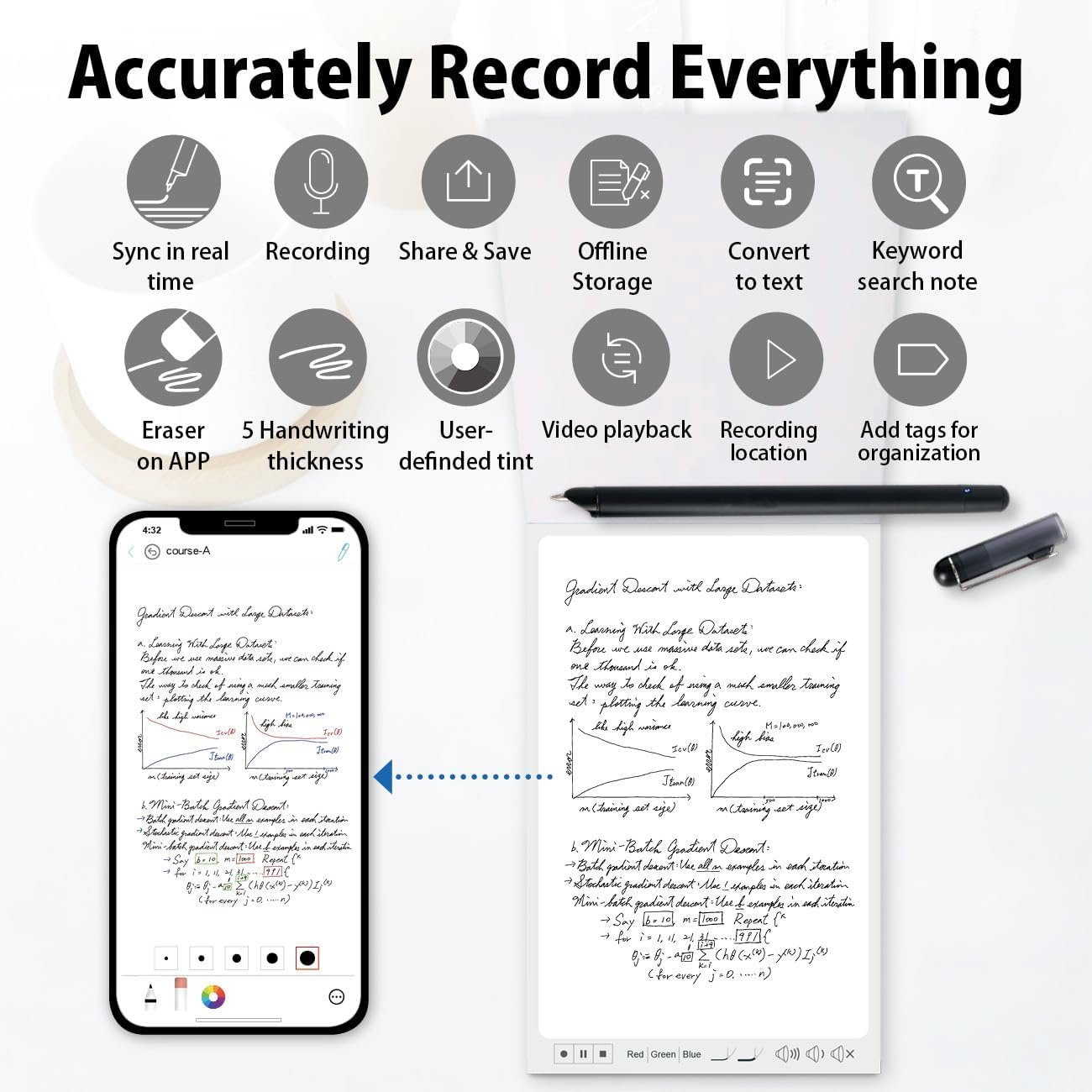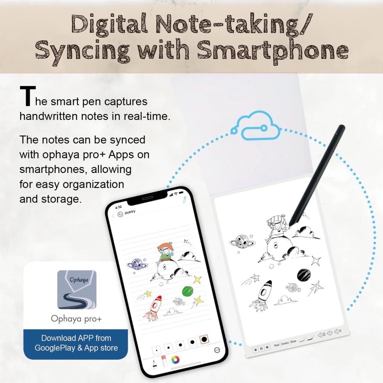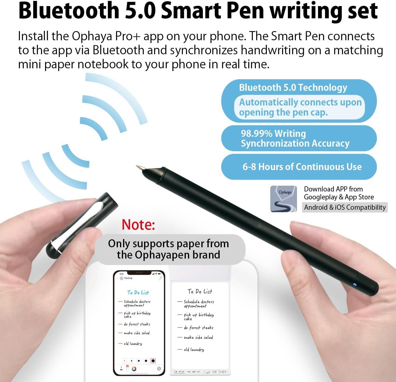 The Smart Pen Set integrates traditional writing with digital, captures handwritten notes on specialized paper or board, instantly syncing them via Bluetooth to the Ophaya pro+ App on smartphones.