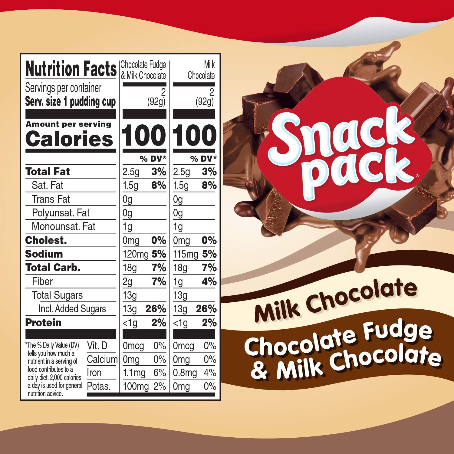 Snack Pack Milk Chocolate and Chocolate Fudge/Milk Chocolate pudding has 100 calories with zero grams trans fat per 3.25 oz serving. No artificial growth hormones used.* (*No significant difference has been shown between milk derived from rBST-treated cows and non-rBST treated cows.)
