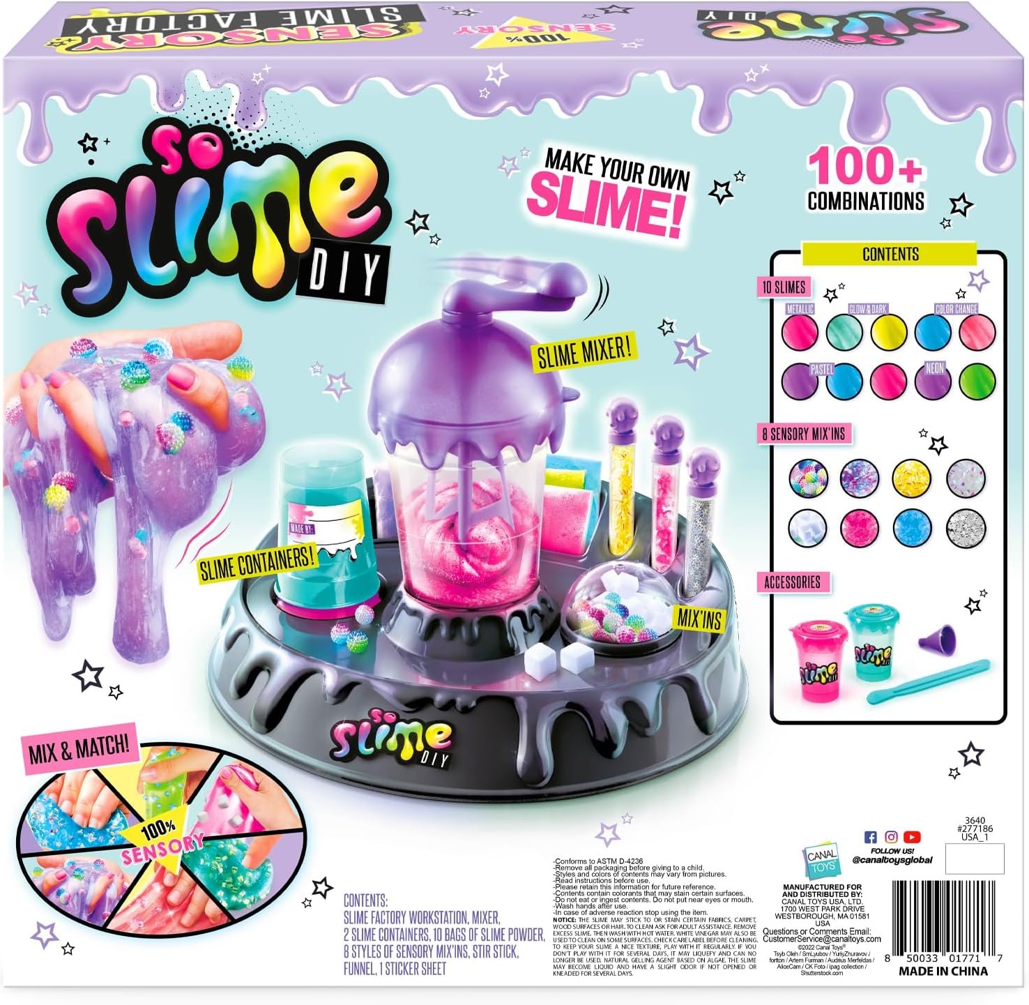 MAKE YOUR OWN SENSORY SLIME! This So Slime DIY Factory contains everything you need to make your own slime sensations…just add water! Choose your own sensory mix’ins combos to create unique slimes to squish, stretch, crunch, and create all those ASMR feels! It is so simple and easy. Select your slime powder color, add water and turn the crank to mix it up in just minutes. Add decorations and sensory mix’ins to customize. Store your slime creations in the plastic So Slime containers. Includes 1 slime workstation with mixer cup, 3 decoration storage tube,10 slime powder packs, 8 decoration packs, 2 slime storage containers, 1 sheet of stickers, mixing stick, mini funnel tool and instructions. Ages 6+. Styles and colors of contents may vary. Conforms to ASTM-D4326