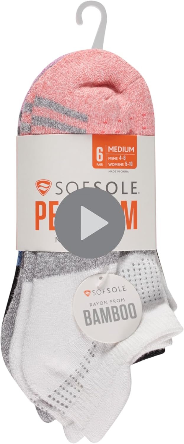 Step into a new level of comfort with SOF SOLE Women’s Performance No-Show Socks. Designed for active lifestyles, these no-show socks for women combine ultra-soft rayon yarn that feels soft against your skin for all-day wear. Mesh ventilation enhances breathability for ultimate airflow, keeping your feet dry, fresh, and free from discomfort, while the cushioned heel and toe zones provide superior impact absorption, making them ideal for running, walking, or everyday errands. The ribbed welt and heel tab keep the socks securely in place, preventing slipping or bunching inside your shoe. Thanks to a smooth toe seam and arch band support, these no-show socks deliver a flexible, snug fit that provides stability and helps reduce irritation during movement. These no-show women’s socks have a flexible fit and maintain their shape and performance wash after wash.. Whether you’re working out or lounging at home, this six-pair, multipack of SOF SOLE Performance No-Show Socks delivers unmatched comfort, durability, and style. Machine washable and made from 67% rayon, 29% polyester, 3% spandex, and 1% rubber