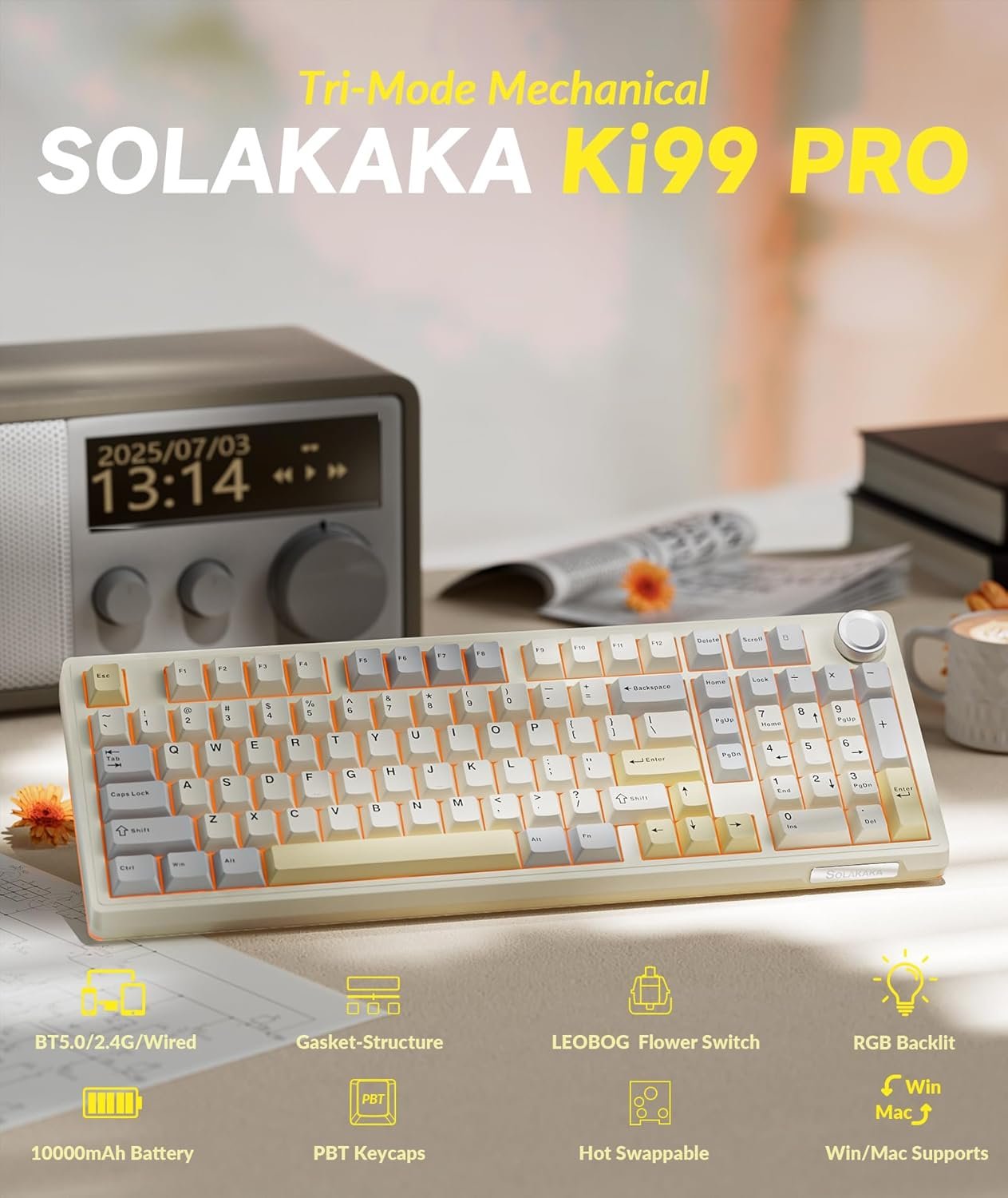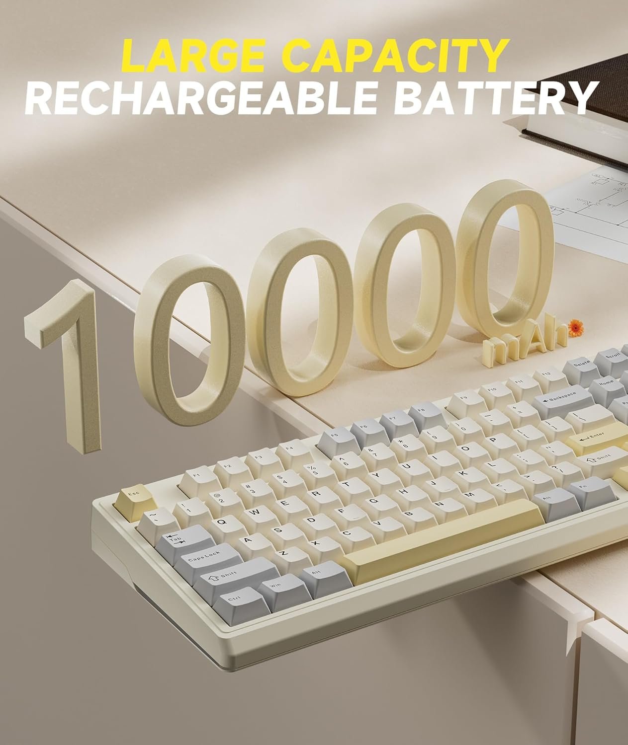 Triple-mode Connectivity & Long-lasting Battery:The KI99pro wireless creamy keyboard supports BT5.0/2.4GHz wireless/Type-C wired connections, with a stable signal transmission up to 10M. Compatible with Windows and macOS systems, it’s suitable for pc/laptops/smartphones, etc. Equipped 10,000mAh high-capacity battery, it reduces charging frequency and enhances usability, ensuring reliable performance during work and gaming