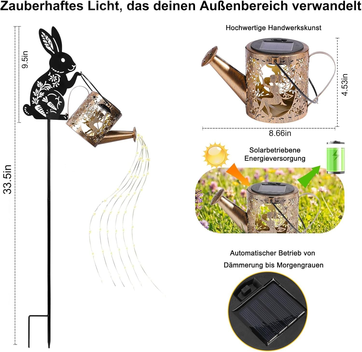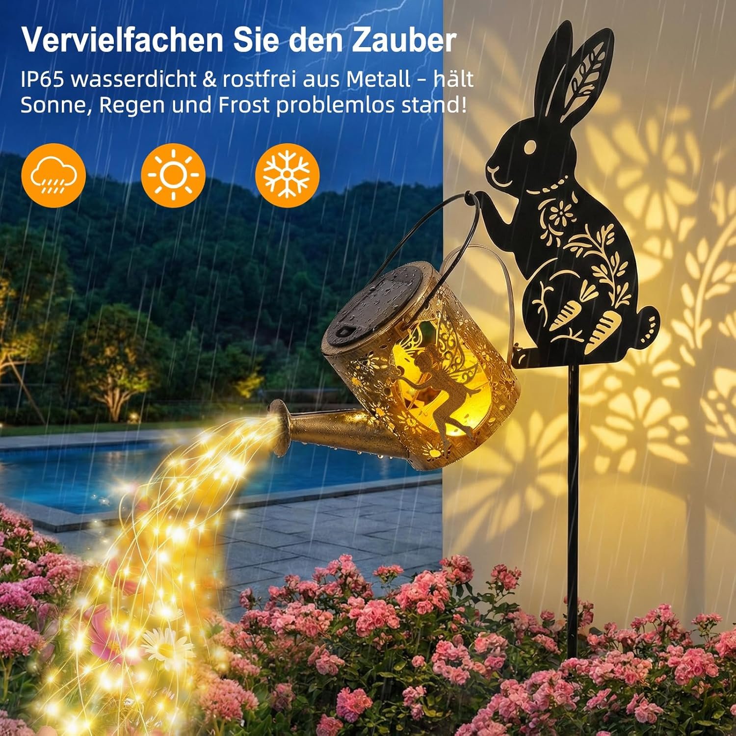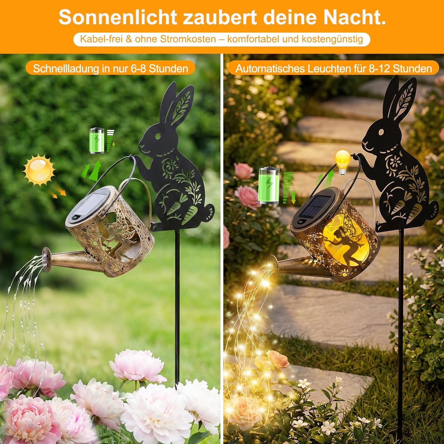 【✨ Magical Waterfall of Lights & Charming Bunny Design】 This solar watering can features a delicate bunny silhouette garden stake and a fairy & floral patterned metal can. When lit, 36 warm white LED lights cascade like a twinkling waterfall, creating a stunning starry flow effect. Perfect for garden, yard, patio, balcony, or pathway decor during both day and night.
