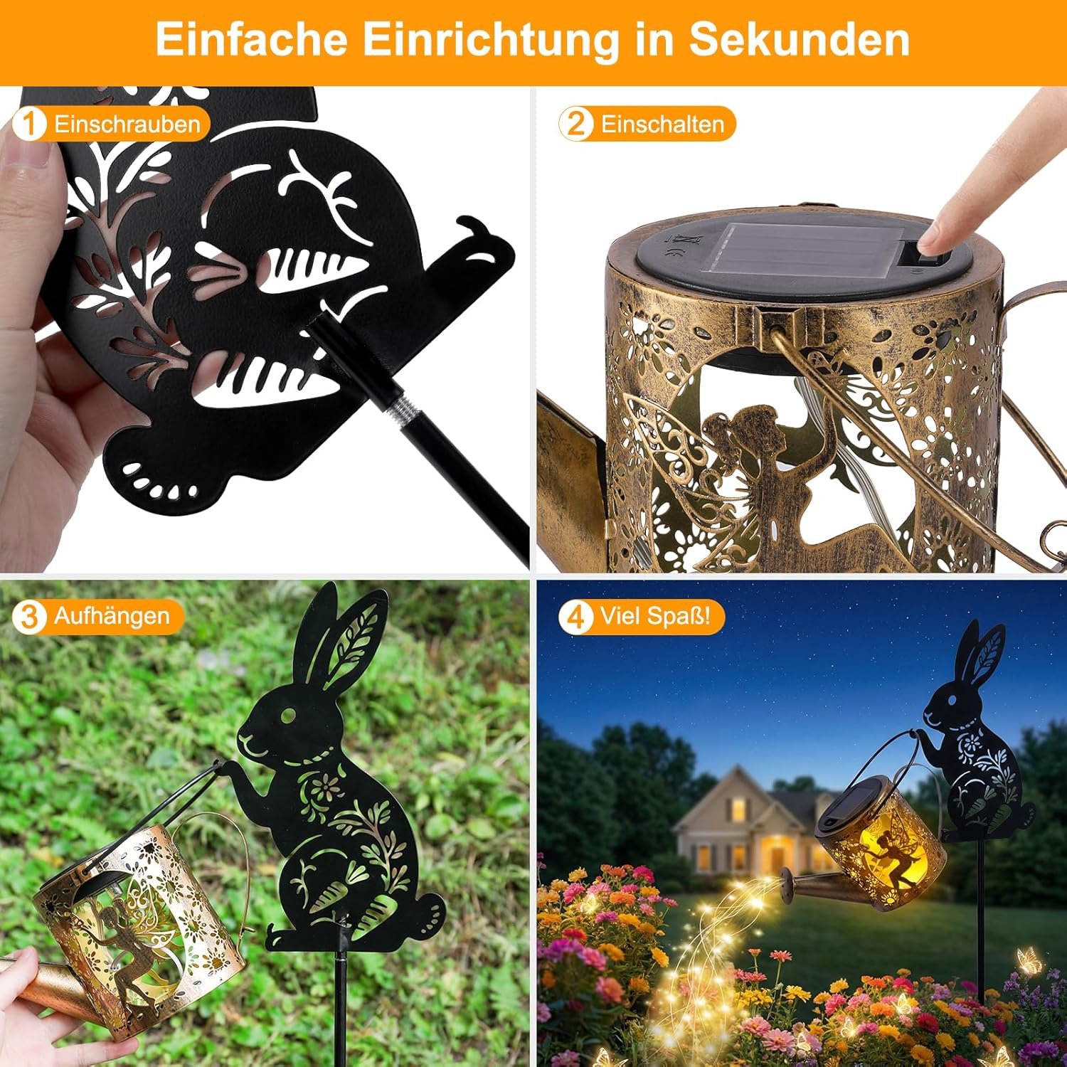 Bring Magic to Your Garden with Solar Watering Can Lights Our solar-powered watering can light combines elegant design with practical function. The graceful bunny silhouette stake and intricate fairy-and-flower metal can create a delightful visual by day, while the cascading warm LED lights transform your space into a magical wonderland by night. Why Choose Our Solar Watering Can Light? ✅ Energy-Efficient & Eco-Friendly – Harnesses solar energy for cost-free, sustainable lighting. ✅ Weather-Resistant & Long-Lasting – IP65 waterproof rating ensures durability in all seasons. ✅ Easy Setup, No Wiring Needed – Just place in direct sunlight and insert into ground. ✅ Perfect Gift Idea – Appeals to garden enthusiasts, pet lovers, and home decorators. ✅ Enhances Outdoor Ambiance – Ideal for gardens, patios, balconies, pathways, and as lawn ornaments. Ideal For: Garden decor, yard art, outdoor solar decor Patio, balcony, porch, and backyard lighting Gift-giving occasions: Mother’s Day, birthday, housewarming, Easter, Christmas Adding a whimsical touch to fairy gardens, flower beds, and landscape decor