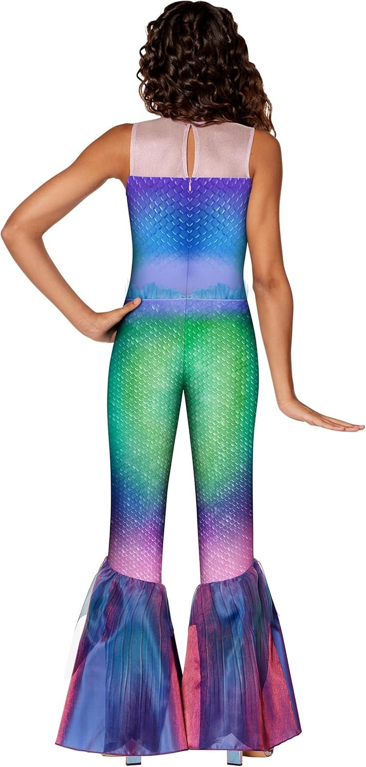 Go on a spectacular journey under the sea in this officially licensed Ariel costume! This stunning outfit includes a sleeveless jumpsuit and a seashell hair accessory. Featuring a sheer yoke with a sweetheart neckline and multi-colored scales in dreamy purple, blue, green, and pink hues, this jumpsuit is fit for a true Disney mermaid.