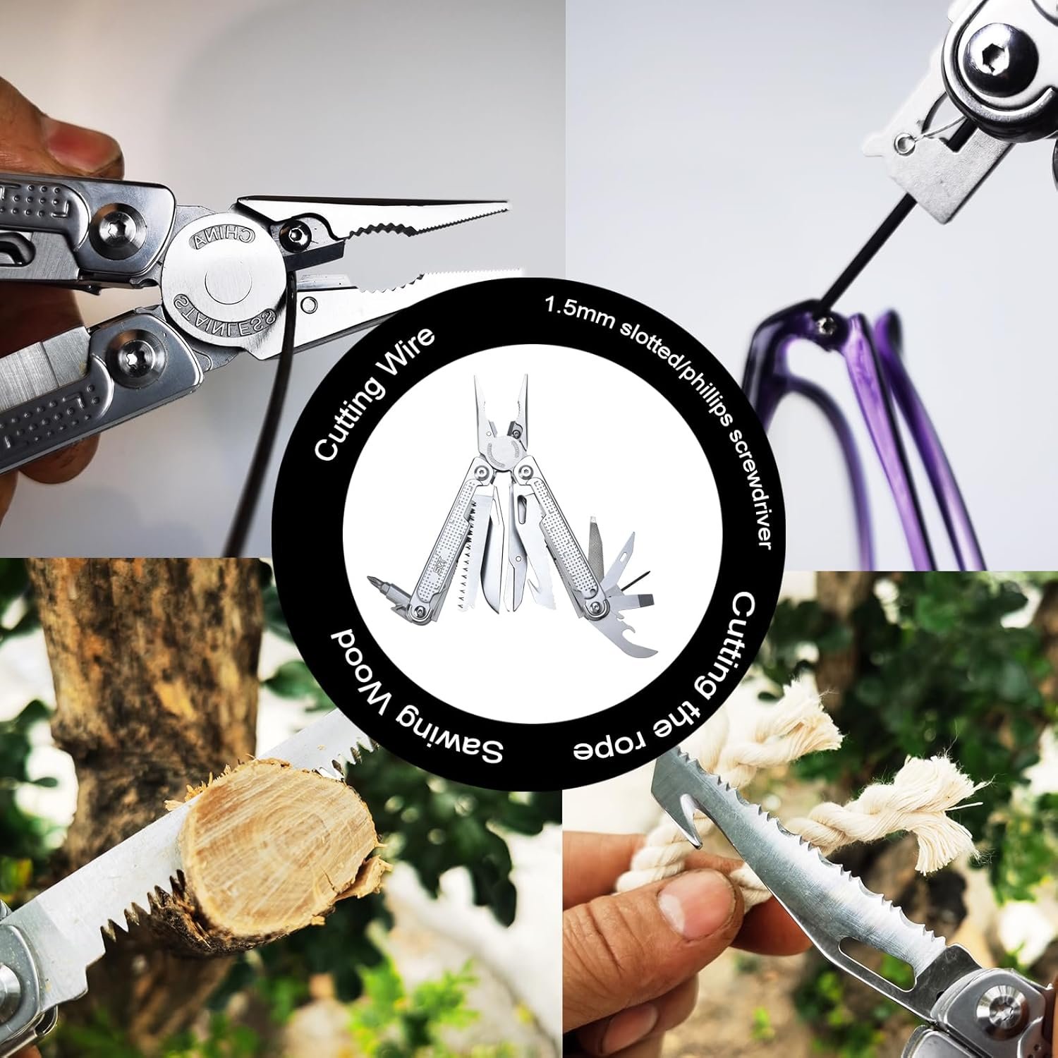 20-in-1 Multitool with Versatile Functions: Includes needle-nose pliers, pipe clamp pliers, tungsten alloy pliers (replaceable), scissors, knife, rope cutter, wood saw, screwdrivers (PH1, 5#, 6#), can opener, wire remover, file, hole puncher, mini head holder, scale, and belt clip. Ideal for DIY, home repairs, and outdoor activities