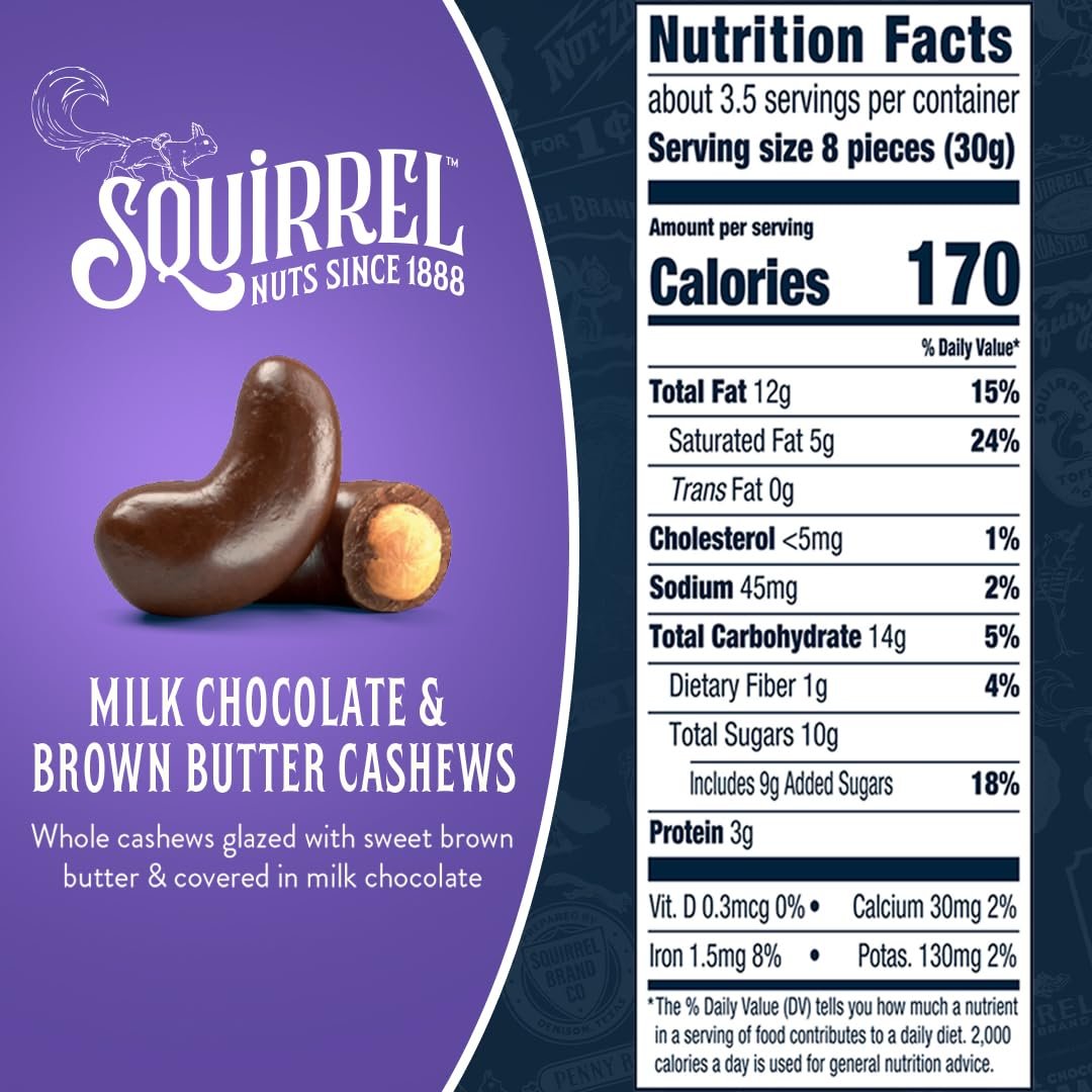 Contains one 3.5-ounce resealable bag of Squirrel Brand Milk Chocolate & Brown Butter Cashews