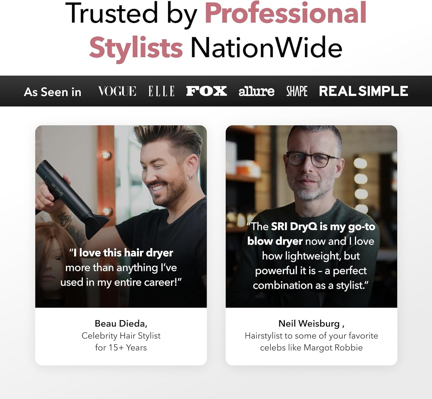 Quiet, Lightweight & Travel-friendly: Weighing only 11.8 ounces and operating at a quiet 79 decibels, DryQ offers powerful performance in a compact, noise-reducing design—ideal for both home use and travel