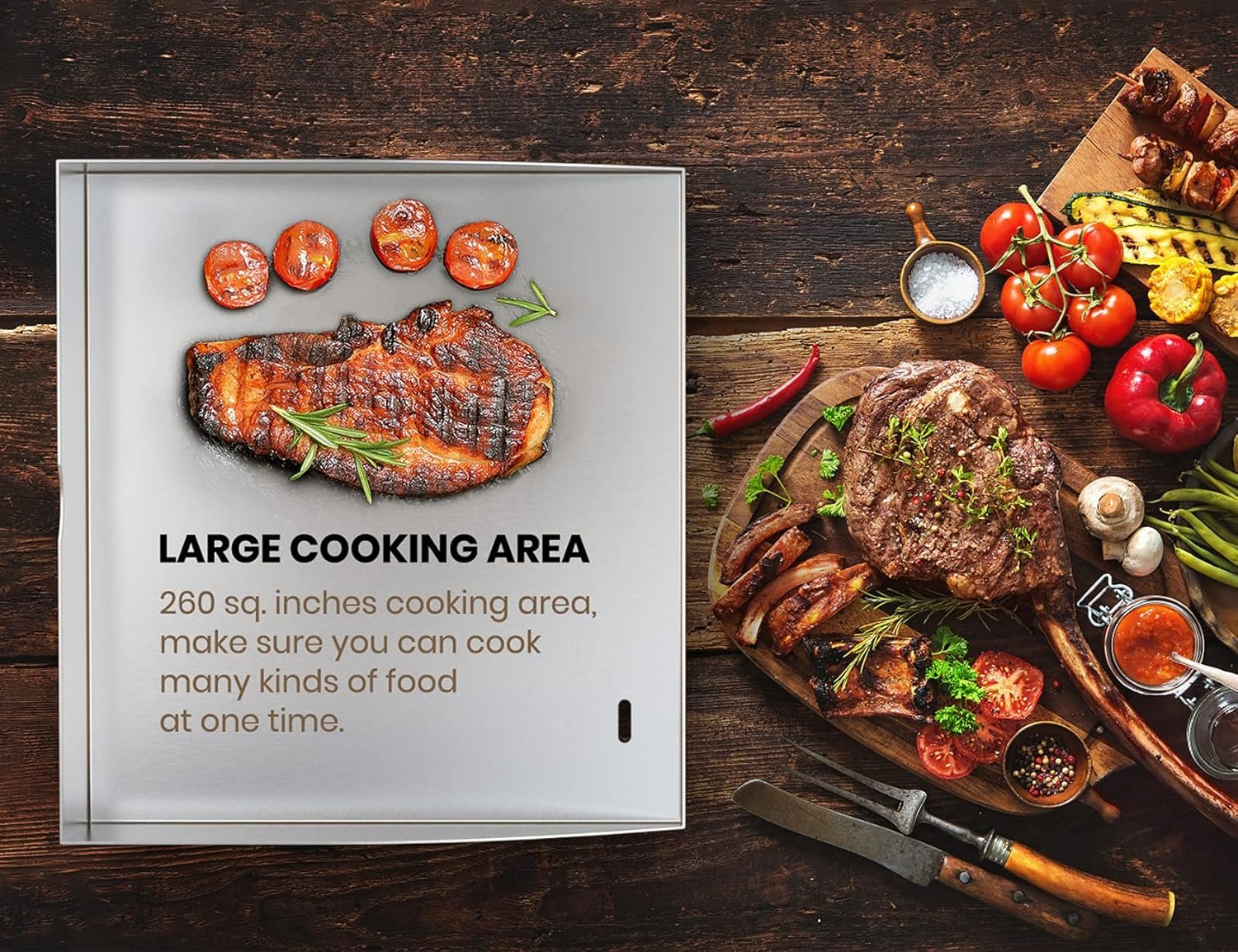 Large Cooking Area: With 17″ x 15.4″ (261 sq. Inches) large surface, the grill accommodates enough grilled food for a large backyard or park barbecue party.
