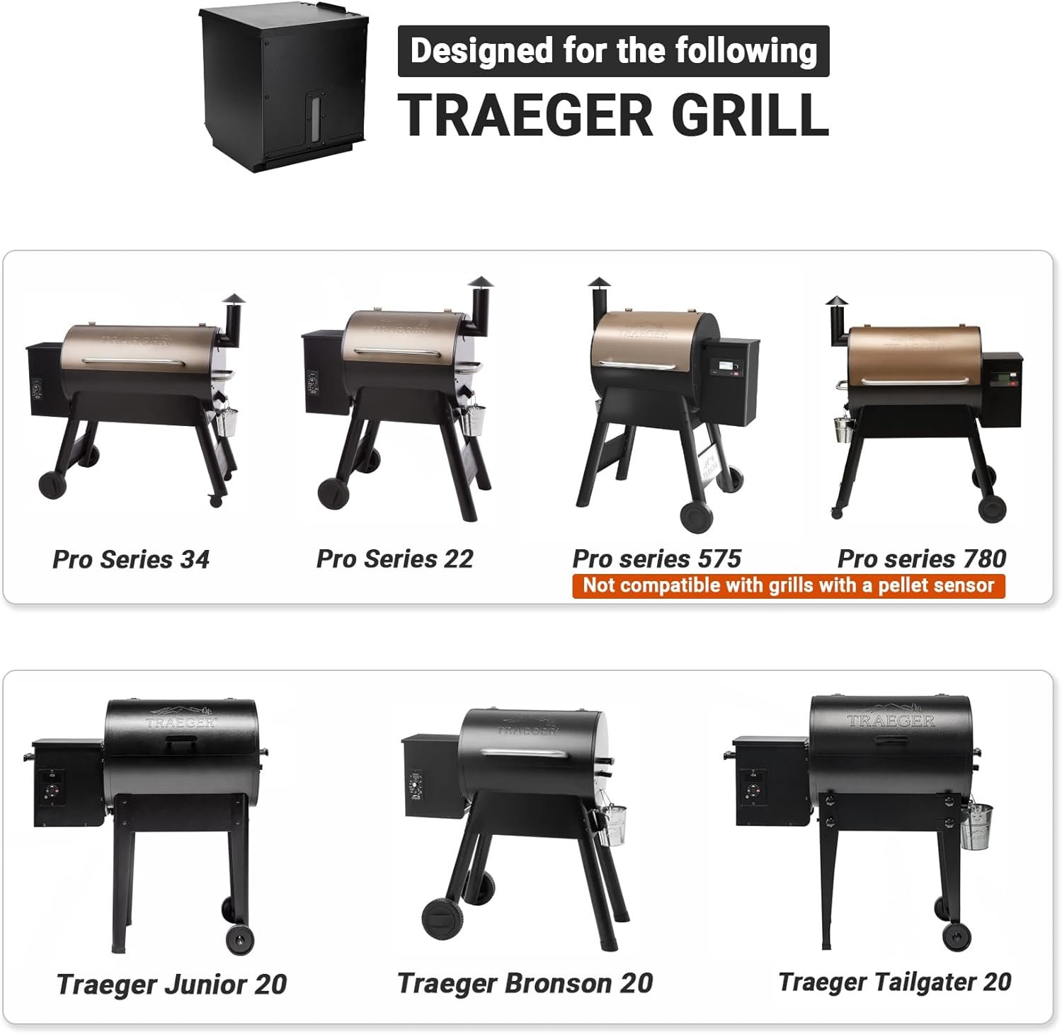 Compatible with Traeger Pro Series 22, 34, Pro Series 575, 780 (without a pellet sensor), Tailgater 20, Junior 20, Bronson 20 wood pellet grill and smoker.