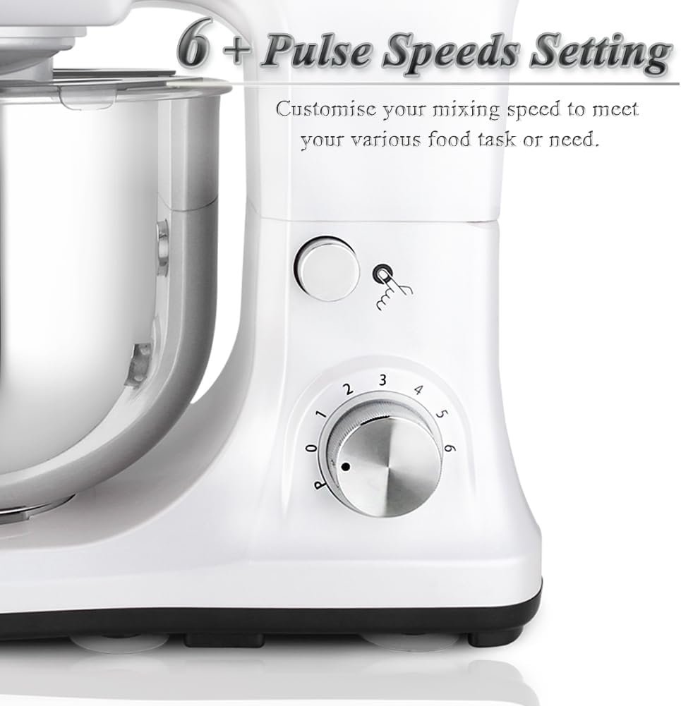【Tilt-Head & Anti-Slip】- There are 6 anti-slip silicone suction cups on the bottom,keeping the kitchen bread mixer in place stably on any countertop with no moving, jogging or rocking during mixing process. Besides, its tilt-head design is great for installing or uninstalling attachments and bowl.