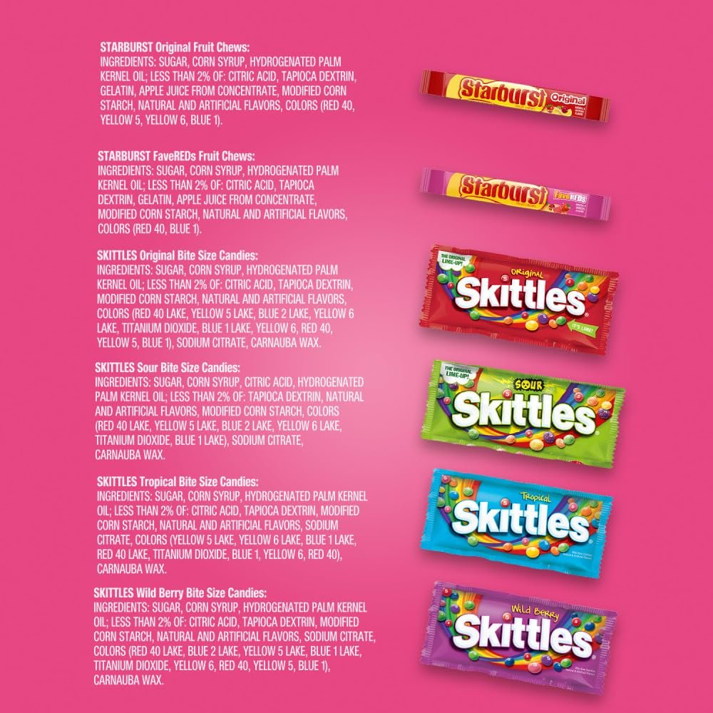 Contains one (1), 62.79-ounce bulk box, 30-count full size STARBURST and SKITTLES Chewy Candy