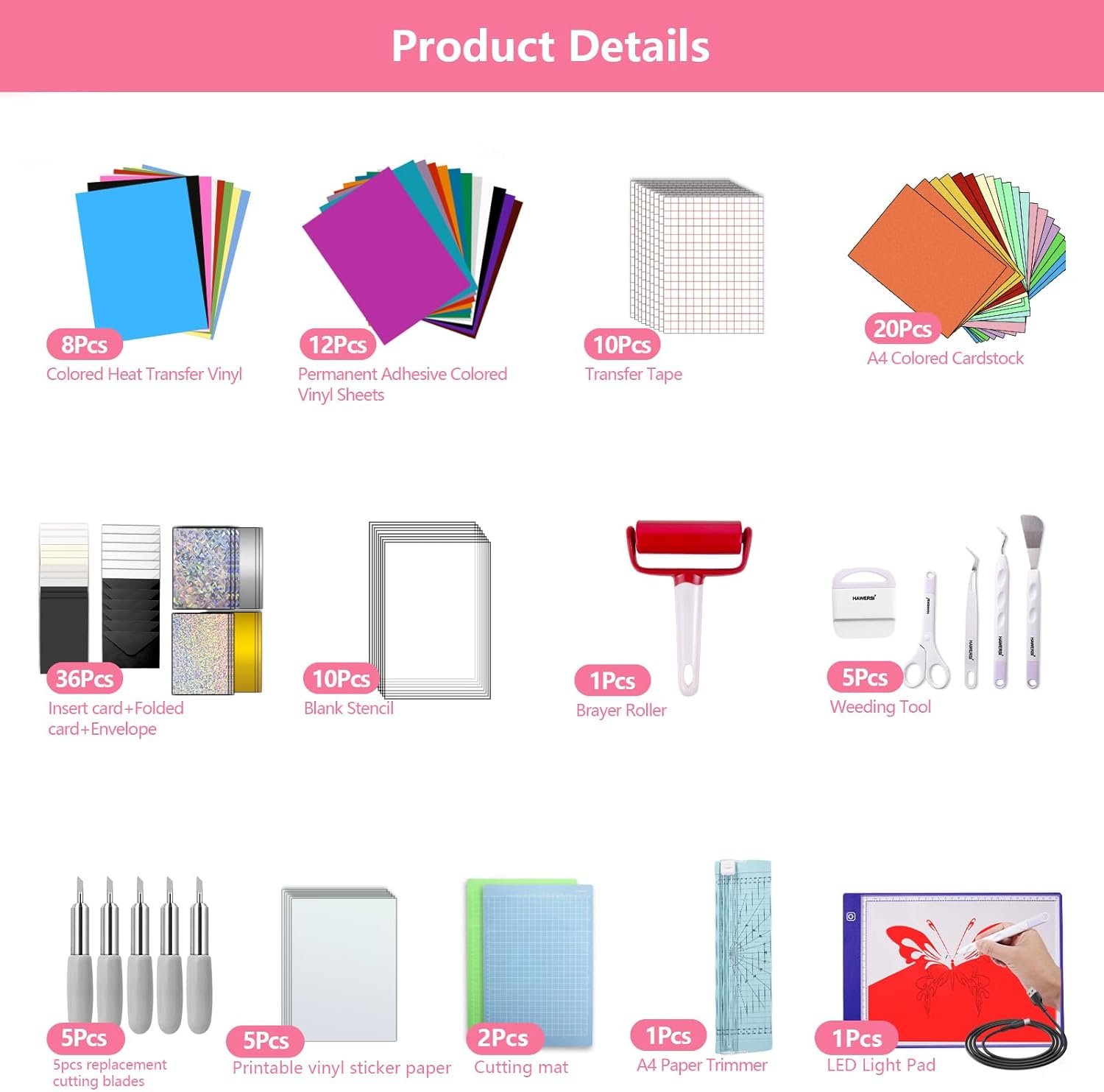 All-in-one Kit:Accessories bundle for joy xtra includes everything you need to create craft projects,including 12pcs permanent adhesive vinyl,8pcs heat transfer vinyl,10pcs transfer tape,5pcs printable vinyl sticker paper,12pcs card,12pcs folded card,12pcs envelope,2pcs cutting mat(light&standard grip),5pcs basic weeding tool set,5pcs joy xtra replacement blade,20pcs A4 cardstock,1pcs brayer roller,10pcs stencil sheets,1pcs paper trimmer,1pcs light pad,your premier choice for crafting freedom