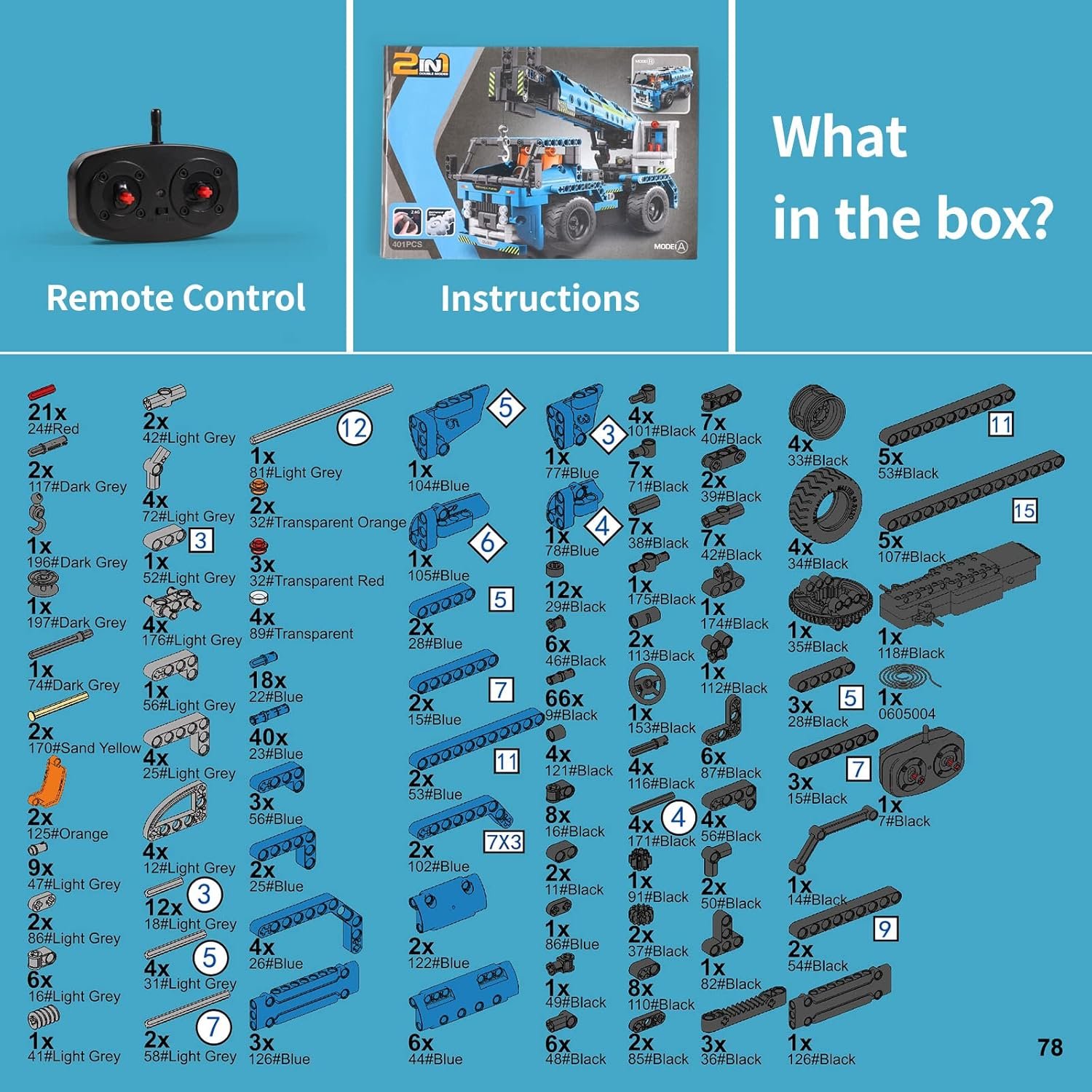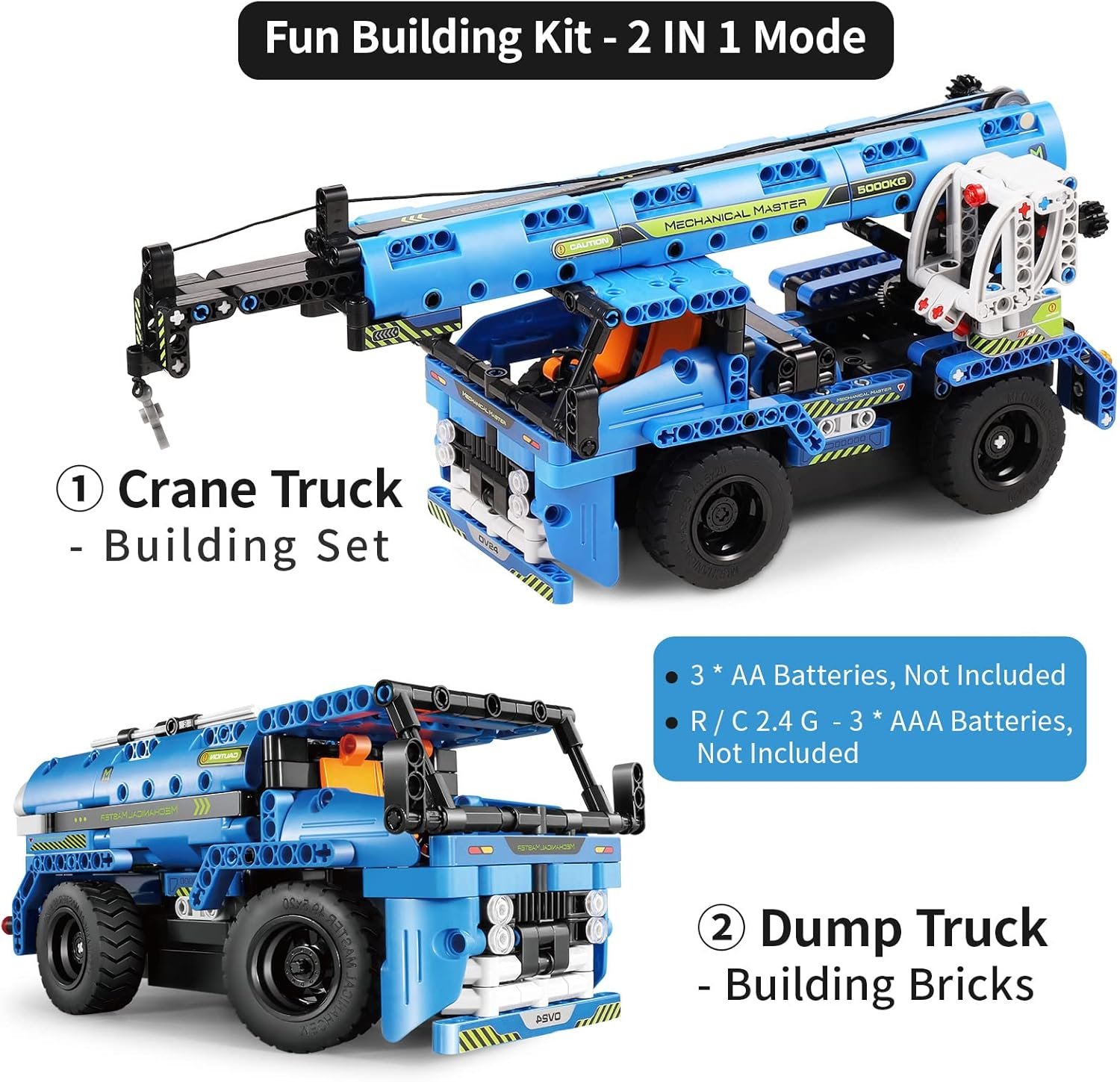 2 IN 1 Remote Control Construction Rc Trucks: This rc crane building toy sets includes 401 pieces, which can be allowed built into a toy crane or a truck. When you’ve finished, use the remote control to drive them! It’s come with a simple remote design that makes them easier to move, drive, turn, and spin on smooth, flat surfaces indoor or outdoor