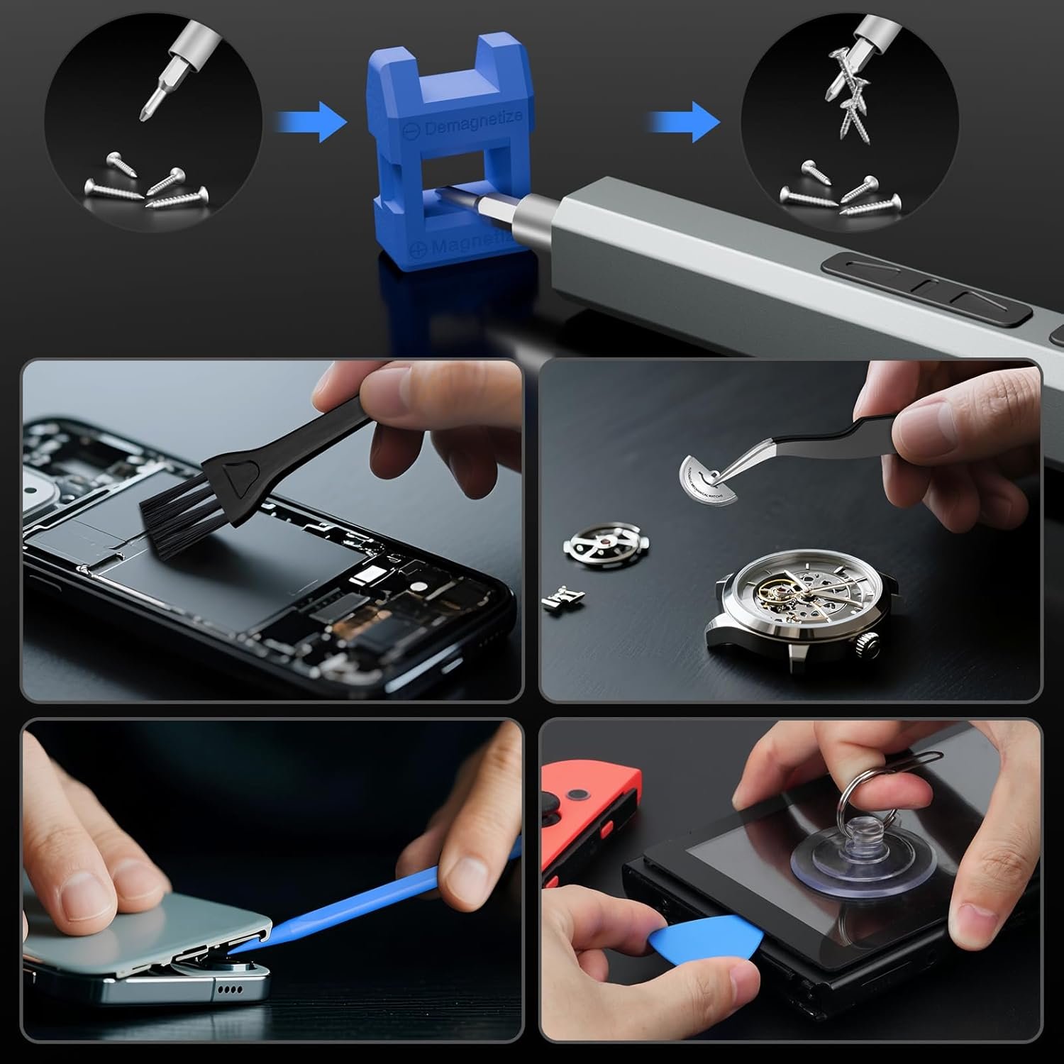 Magnetic Design: We have added 2 magnetic tools in this mini electric screwdriver set to save your time and energy, making your fixing job easier. The magnetizer demagnetizer tool helps strengthen the magnetism of the screwdriver tips to grab screws, or weaken it to avoid damage to your sensitive electronics. The 5.7 x 3.3″ magnetic project mat keeps all micro screws and parts organized, preventing loss and mes