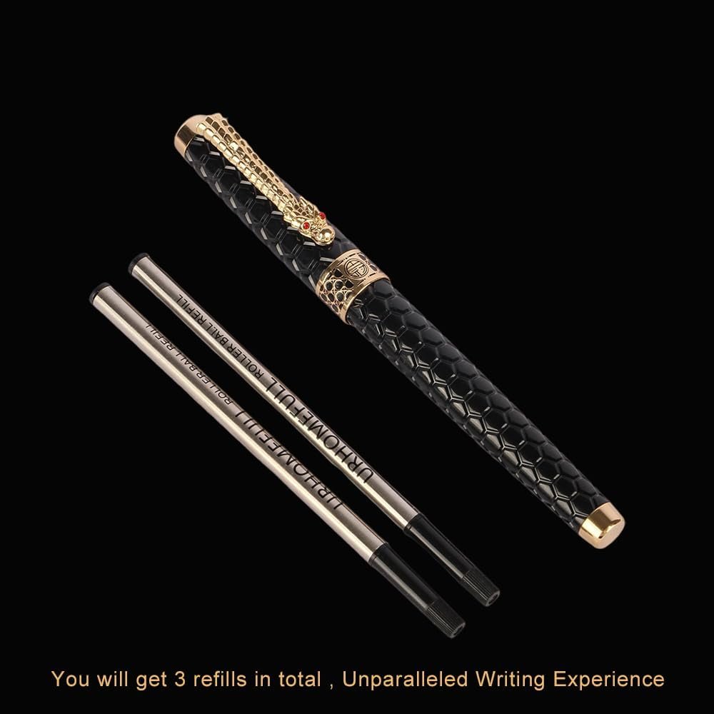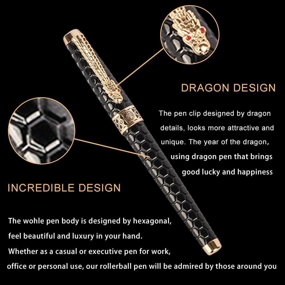 UNIQUE PEN IN YOUR HAND: Elegant and stylish rollerball pen with solid brass with jet-black lacquer finished in real 24 karat gold,feeling substantial and premium when writing. The entire pen barrel is hexagonal in design with dragon design pen clip, you will feel amazing and incredible about the beautiful design.
