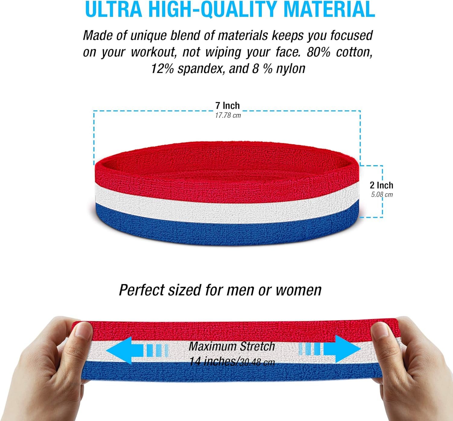 INCREDIBLY SOFT AND COMFORTABLE MATERIAL: Our headbands for men and women are crafted from a unique blend of cotton, nylon, and spandex. These sweat headbands are gentle on the skin, preventing irritation during exercise, spin classes, or cycling. The headband (7″ x 2″) and wristbands (3″ x 3.5″) have been designed to prioritize your comfort.