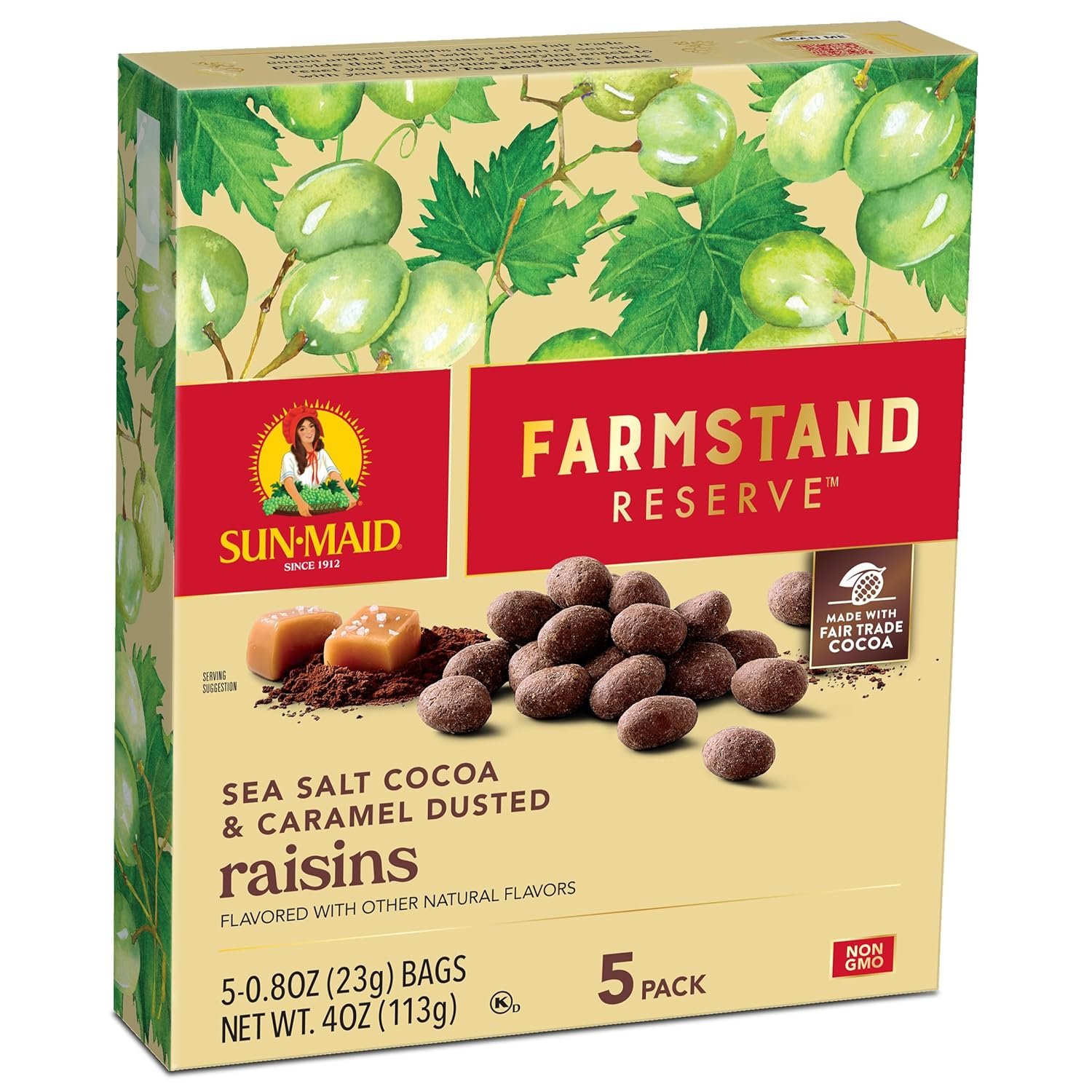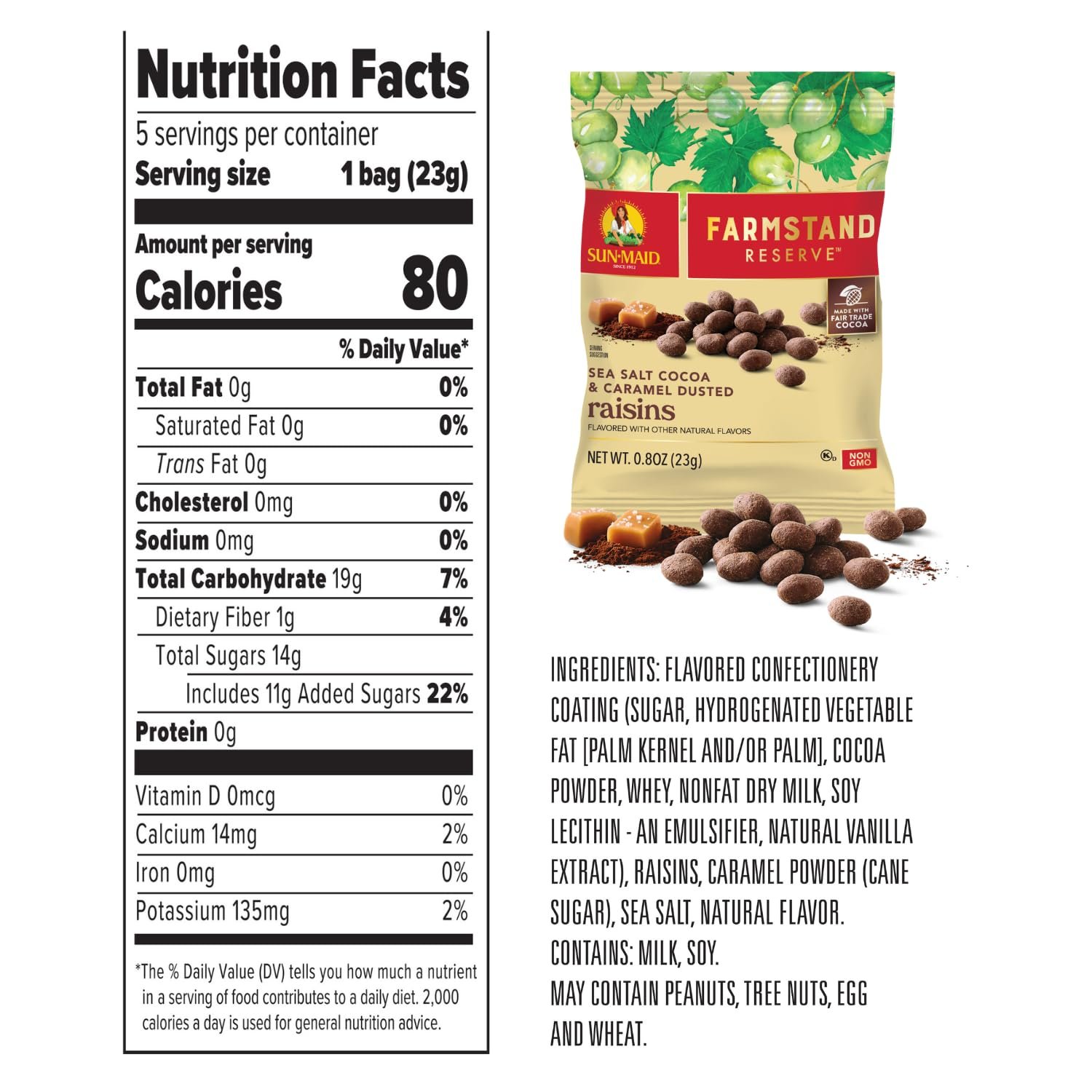 SEA SALT COCOA & CARAMEL DUSTED RAISINS: Whole, sweet sun-dried raisins dusted in fair trade cocoa and caramel with a touch of sea salt are a delicious, dried fruit snack, enjoyed anytime, anywhere