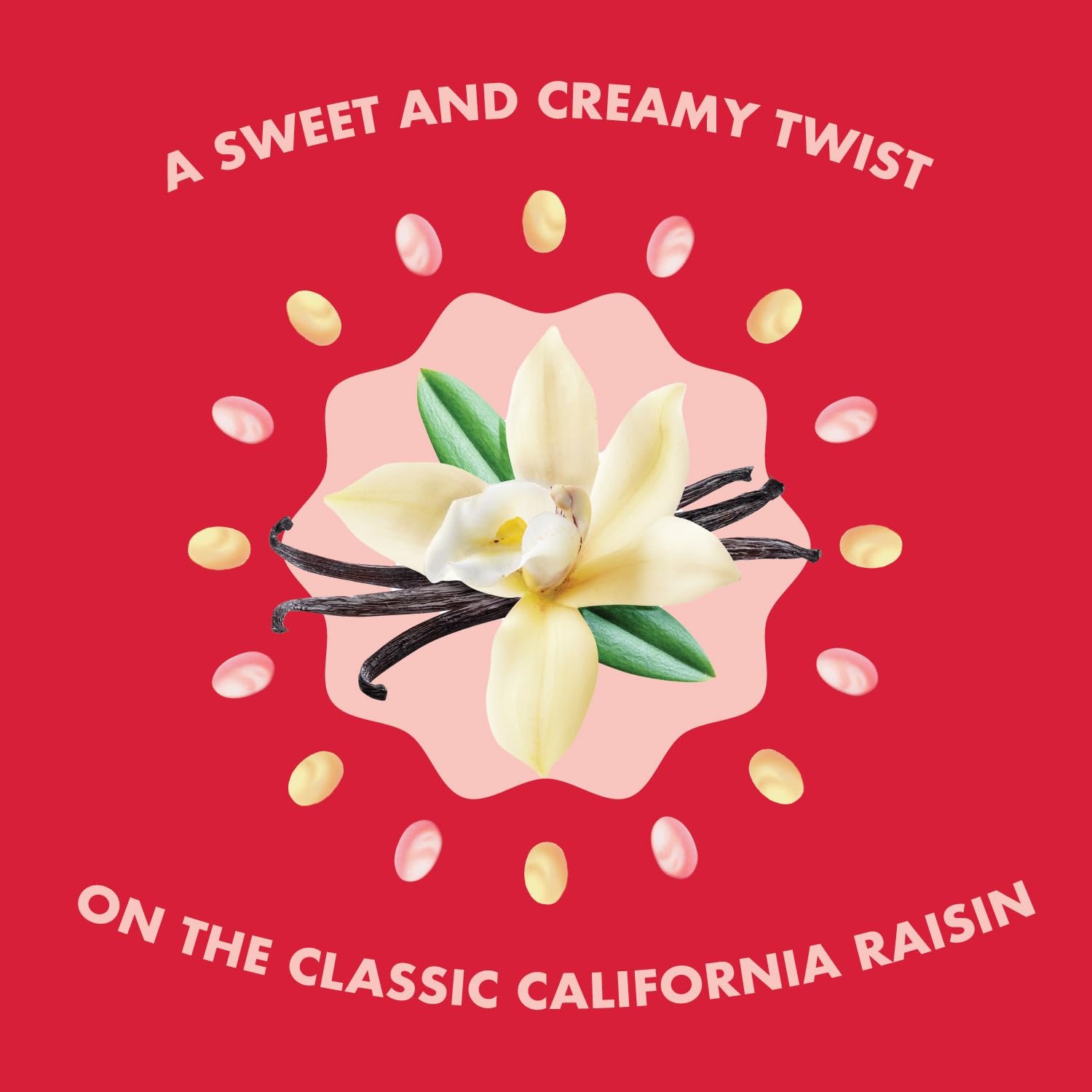 STRAWBERRY & VANILLA YOGURT COVERED RAISINS: California Sun-Dried Raisins wrapped in a smooth and creamy coating of strawberry and vanilla yogurt for a sweet, fruity treat