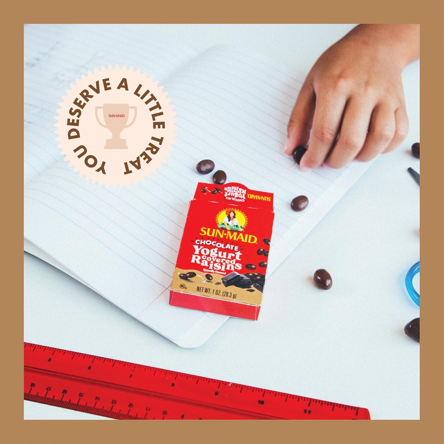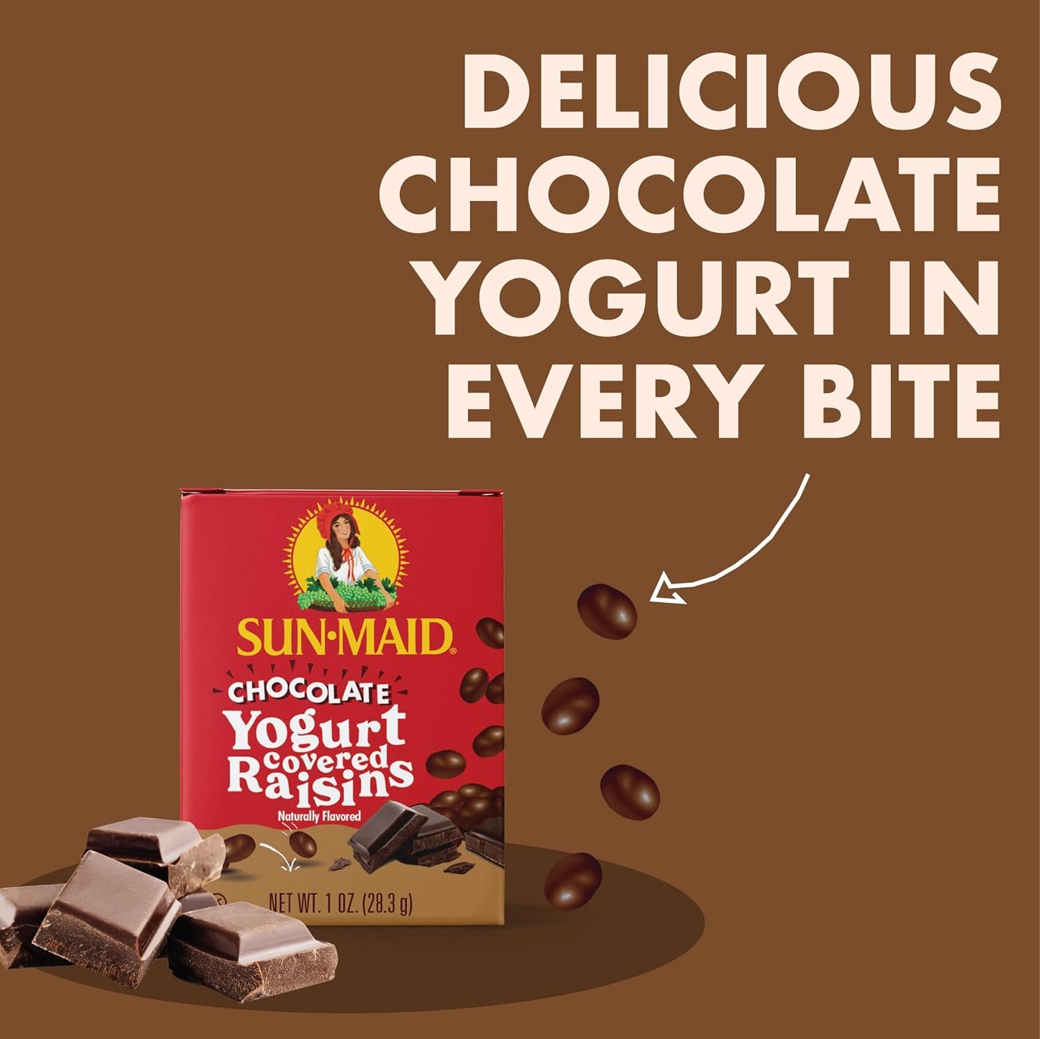 SUN-MAID DRIED FRUIT SNACKS: Sun-Maid Yogurt Covered Raisins also available in strawberry yogurt, strawberry vanilla yogurt, and chocolate vanilla yogurt; *All Raisins have 0g added sugars. Not a calorie reduced food. See nutrition panel for sugar and calorie content.