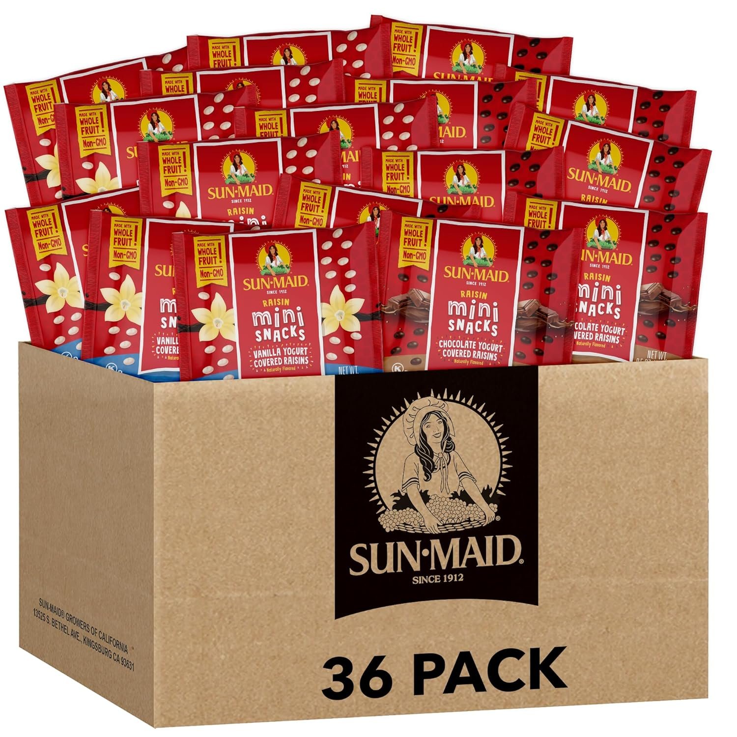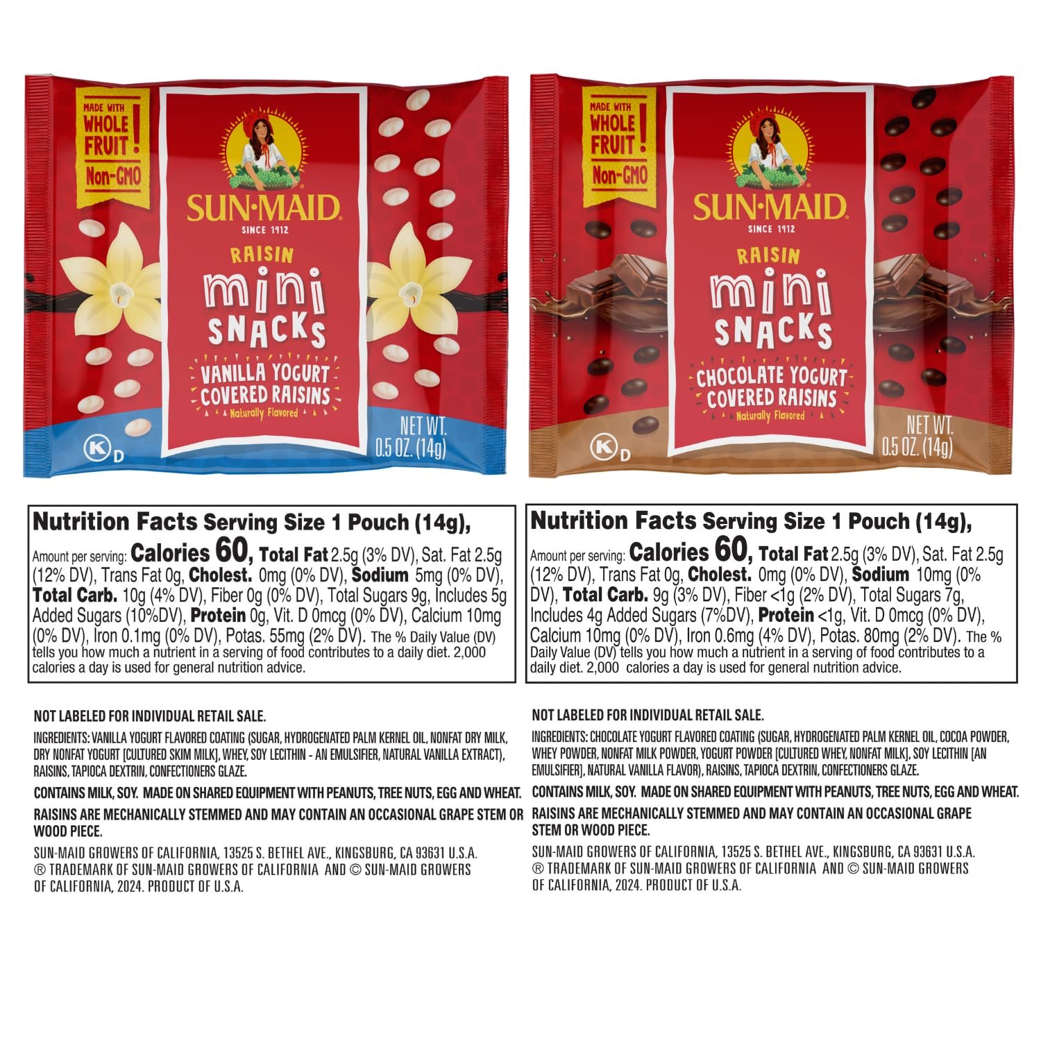 VARIETY SNACKS FOR ADULTS AND KIDS: Includes 36 mini snack packs of Vanilla Yogurt Covered Raisins and Chocolate Yogurt Covered Raisins, 18 of each flavor