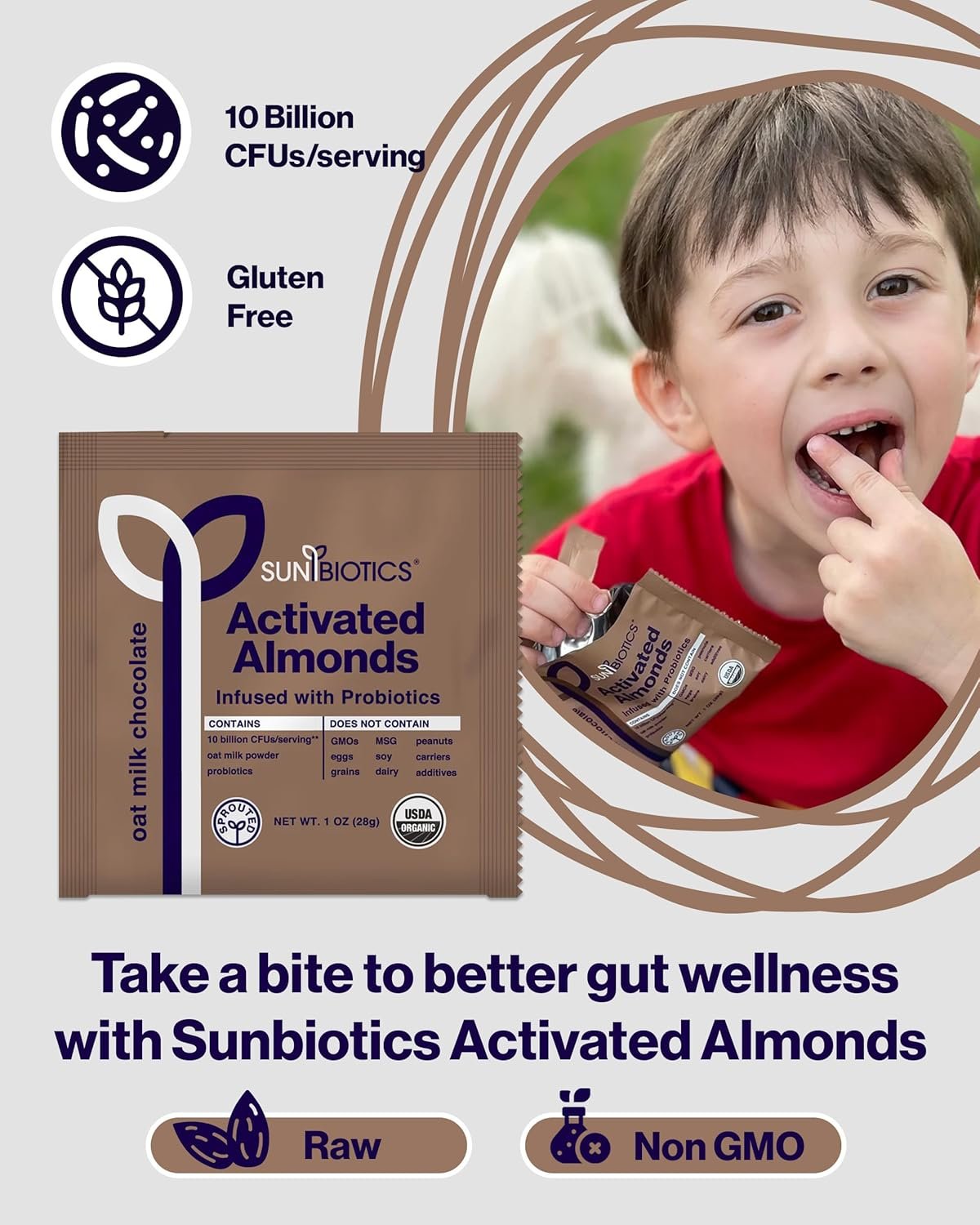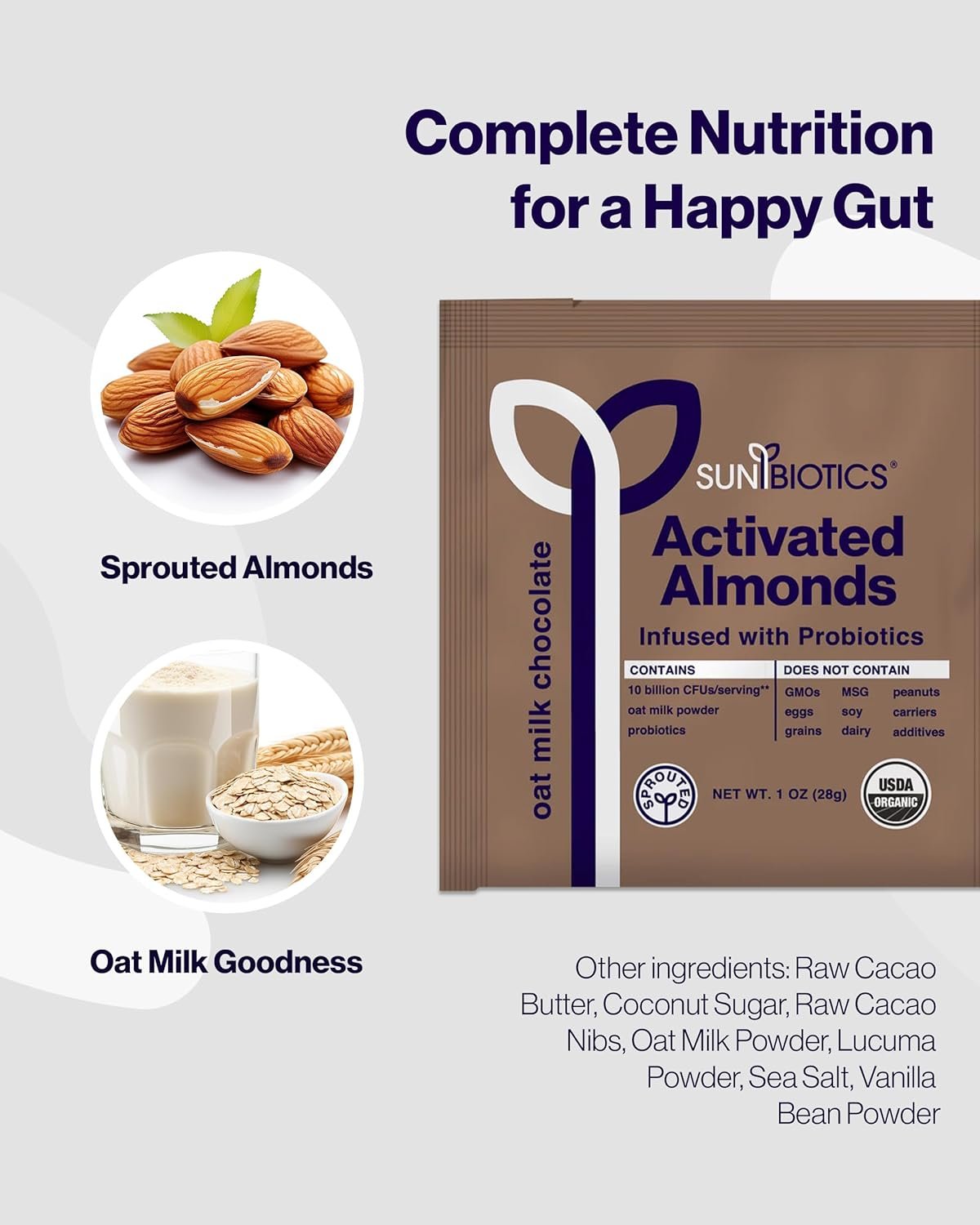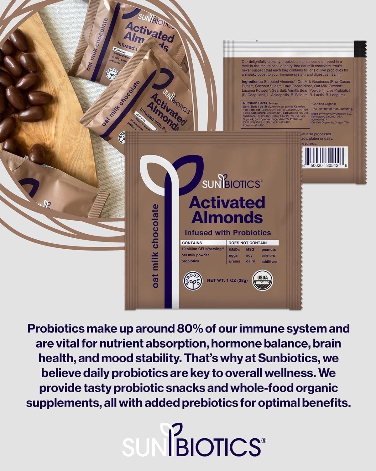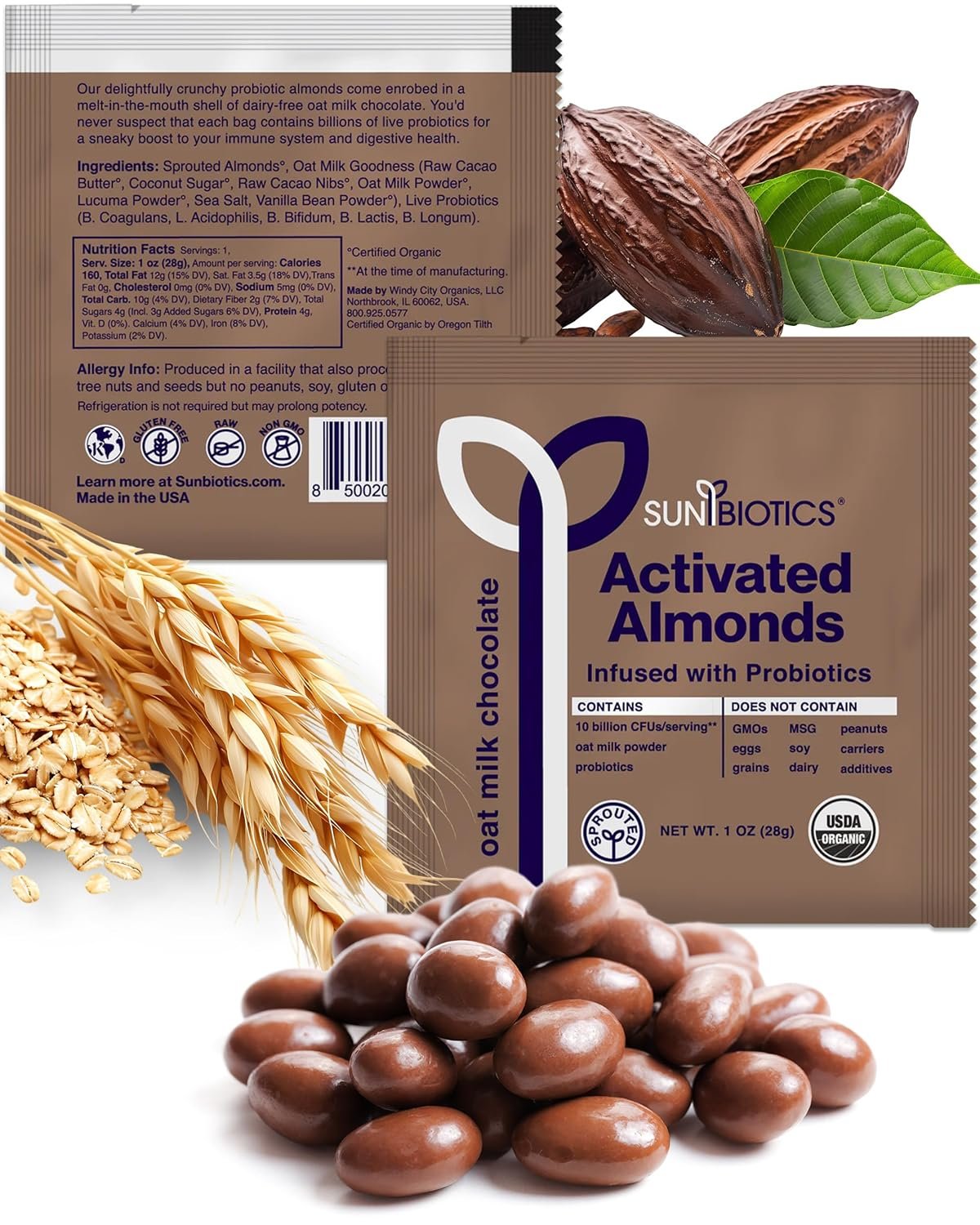Gut-Nourishing Organic Almonds: Get the highlight of taste and wellness with Sunbiotics Activated Almonds. Carefully sprouted and infused with plant-based probiotics, these oat milk chocolate flavored almonds offer a delicious flavor to the palette while supporting digestive balance.