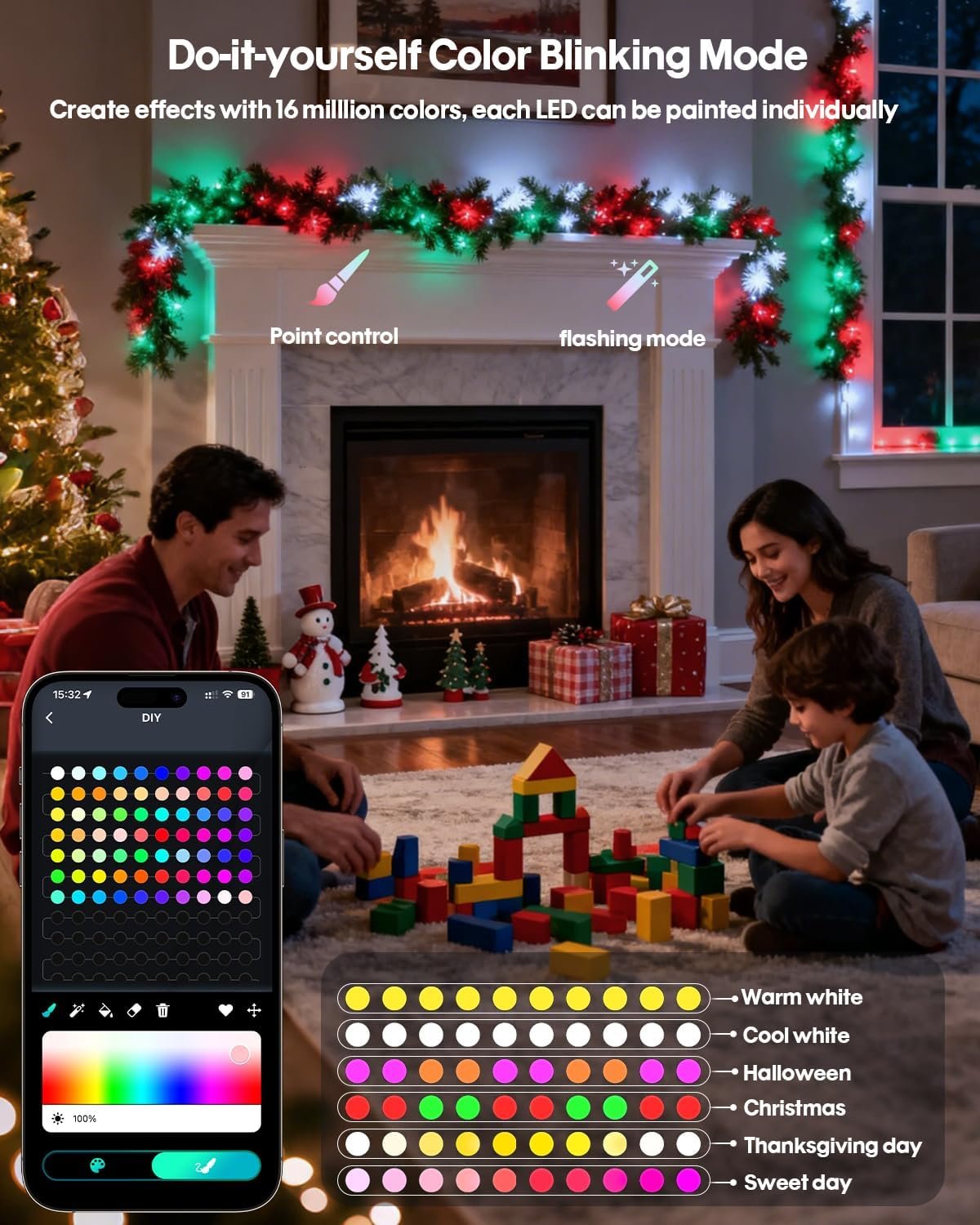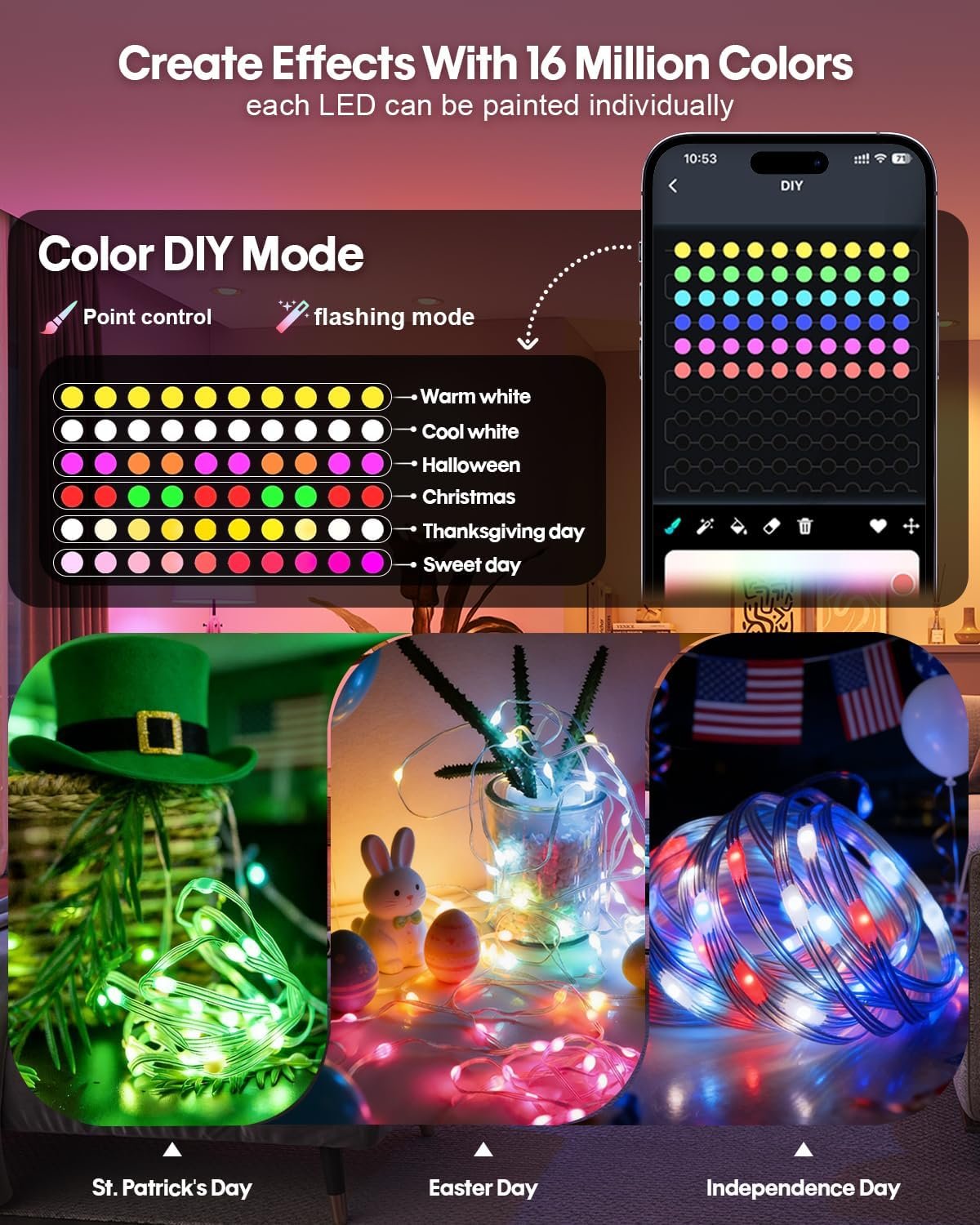 Decorative Flexiblity: Color changing fairy lights has high-end control technology that provides greater flexibility for indoor and outdoor decorating. Support LED beads in 16 million colors in the independent DIY selection, able to control each LED individually, you can also according to different holiday atmosphere and the overall mood to switch their favorite flashing mode, adjust the spacing between the bulbs flashing, shape and length