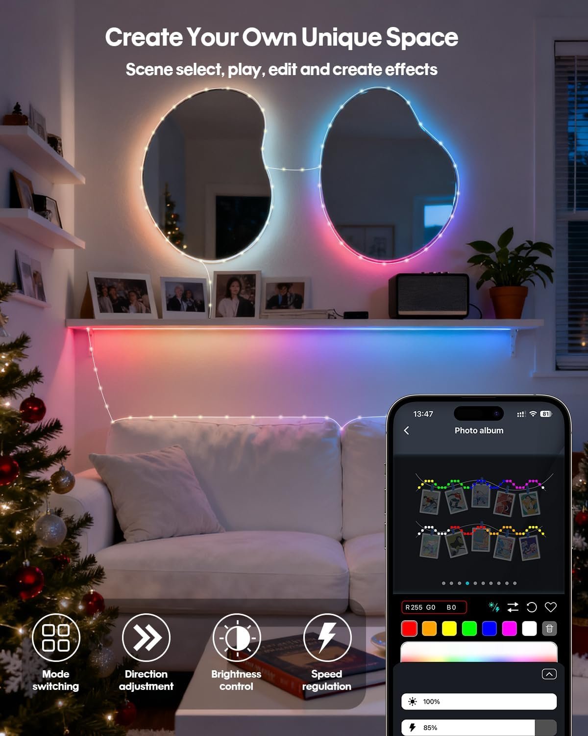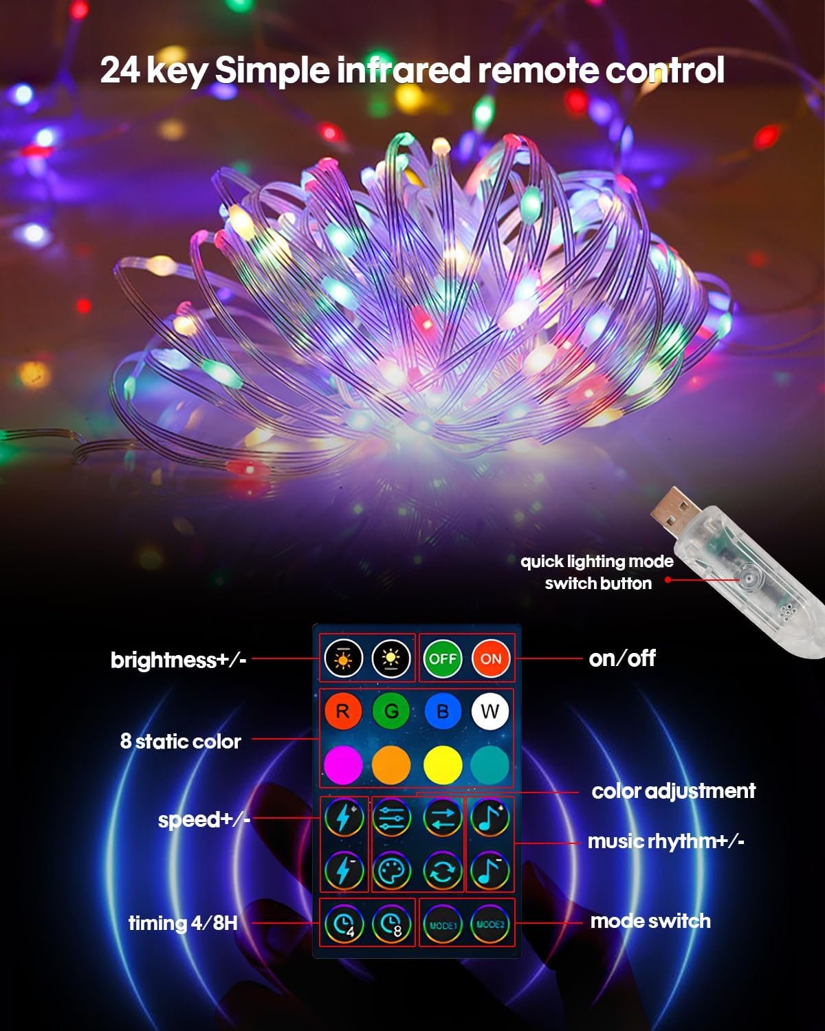 APP & IR-Remote Control: Set up your fairy string lights in seconds by connecting Bluetooth , compatible with iOS and Android. Easily manage your favorite twinkle lights, group multiple devices, create personalized lists, and control on/off, dimming, brightness adjustments and much more. For example, through the application or IR-Remote control fairy lights effect: 28 modes such as single-color static, single-color gradient, multicolor gradient, and more. The application also supports integration with other Super RGB indoor series lights