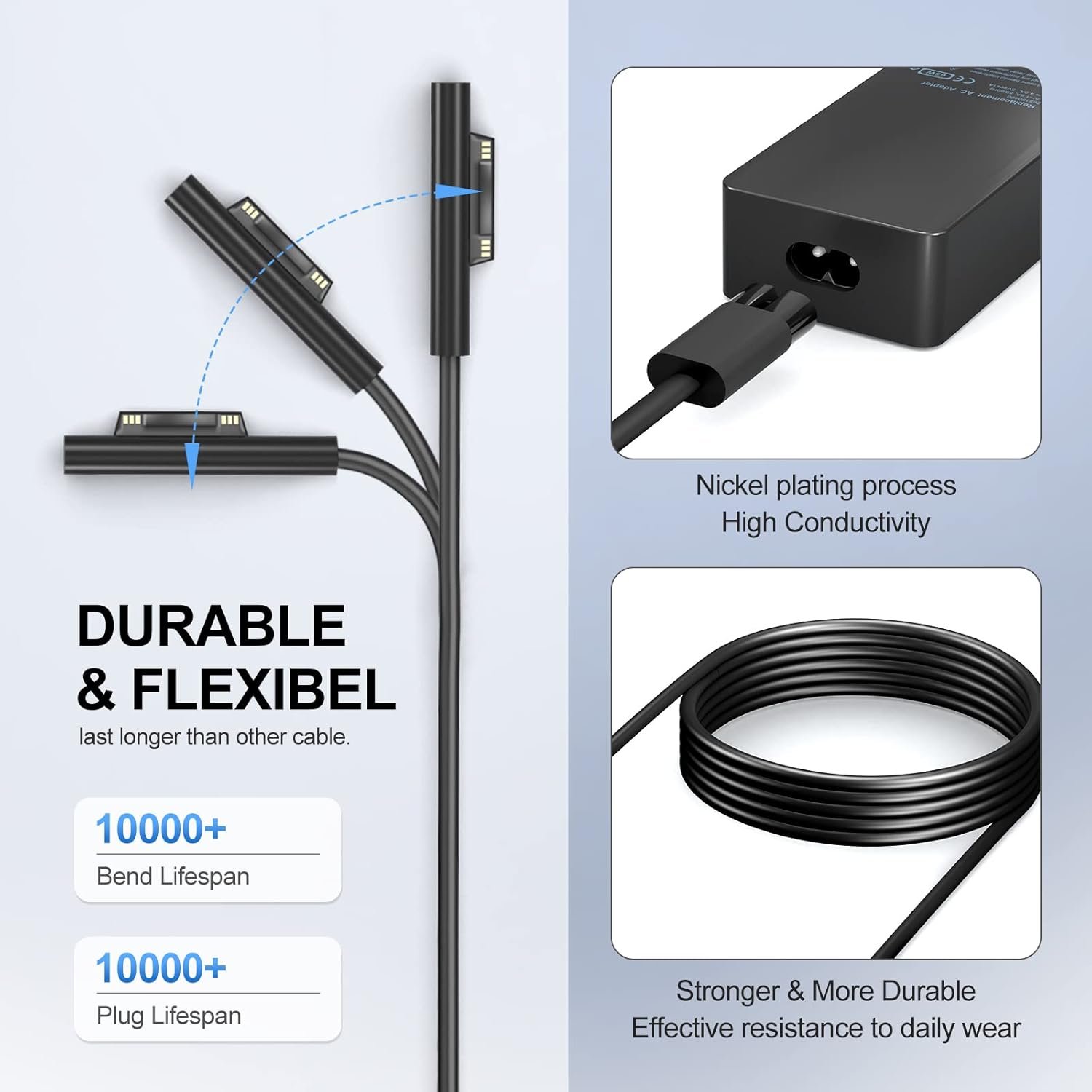 【EFFICIENCY&SAFETY CHARGING】This surface pro charger is made of high quality materials to ensure high charging efficiency can charge a laptop quickly and stably without affecting its performance or life, with built-in circuit protection to ensure the safety during the using