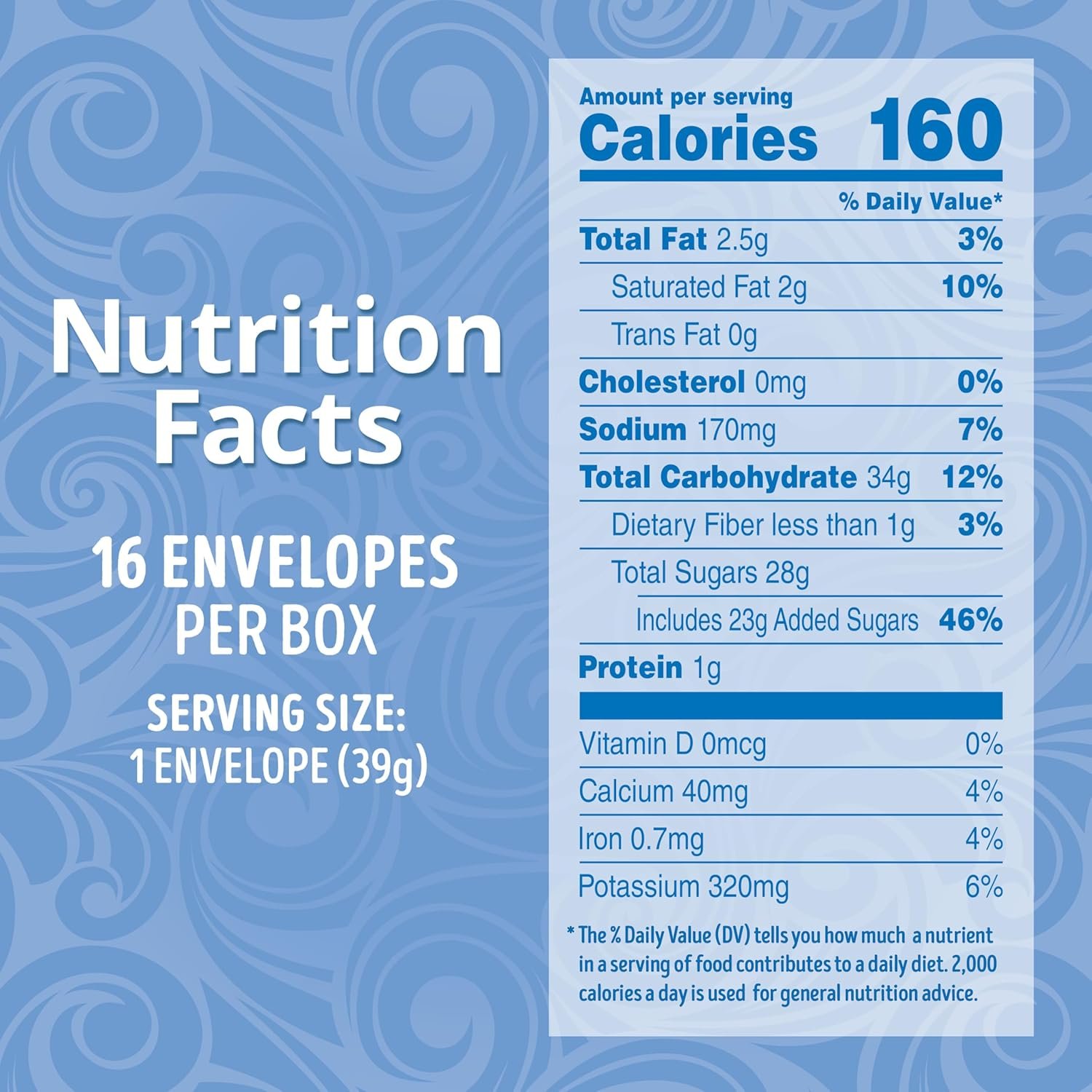 Savor the classic taste of hot cocoa with Swiss Miss Hot Cocoa Drink Mix, Milk Chocolate flavor. Rich, creamy and chocolatey, this hot cocoa mix delights on a cold day or whenever you’re craving a mug of hot cocoa. With this family pack box of 16 individual cocoa mix packets, there’s plenty to share. Whip up a cup or two by emptying cocoa mix into a mug, adding hot water or milk for a more decadent taste, then stir, sip and savor. When prepared according to package directions, this Swiss Miss cocoa makes a 33% larger mug* than the next leading brand. Swiss Miss Milk Chocolate flavor cocoa contains no artificial sweeteners, preservatives, flavors or colors and is 99.9% caffeine-free. * Swiss Miss makes 8 oz of cocoa, next leading brand 6 oz