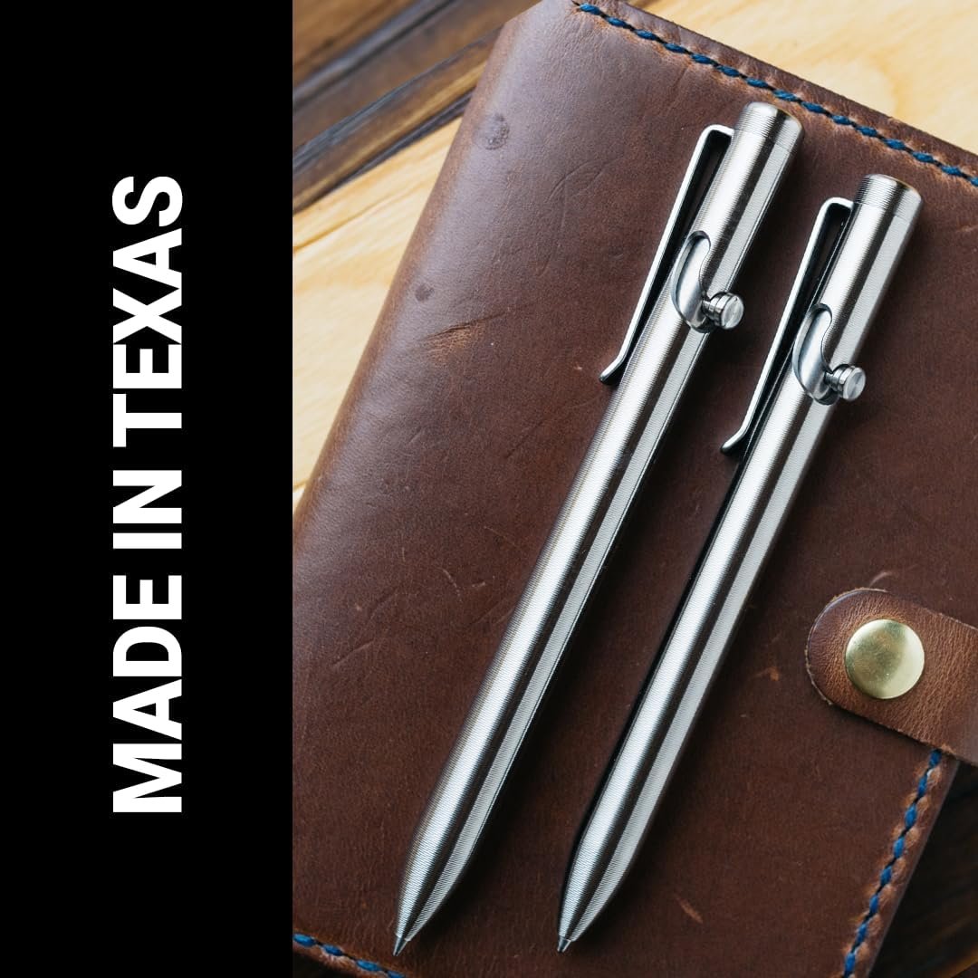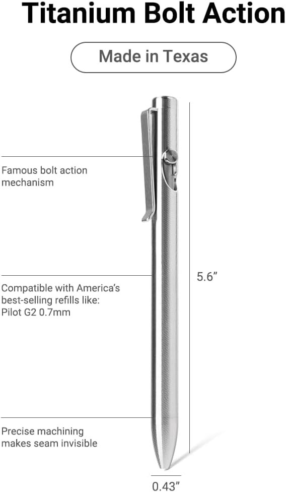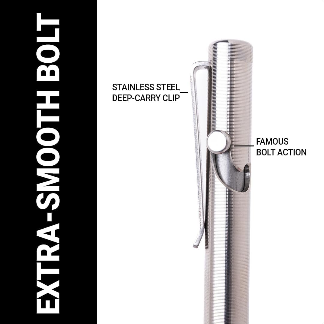Bolt Action Mechanism. The unique bolt action shape allows for one fluid motion to advance or retract the refill. The action feels amazingly satisfying because both the bolt and the mechanism are precision-machined to be extra smooth. The secure lock stays in the desired state whether you’re writing or carrying the pen in your pocket.