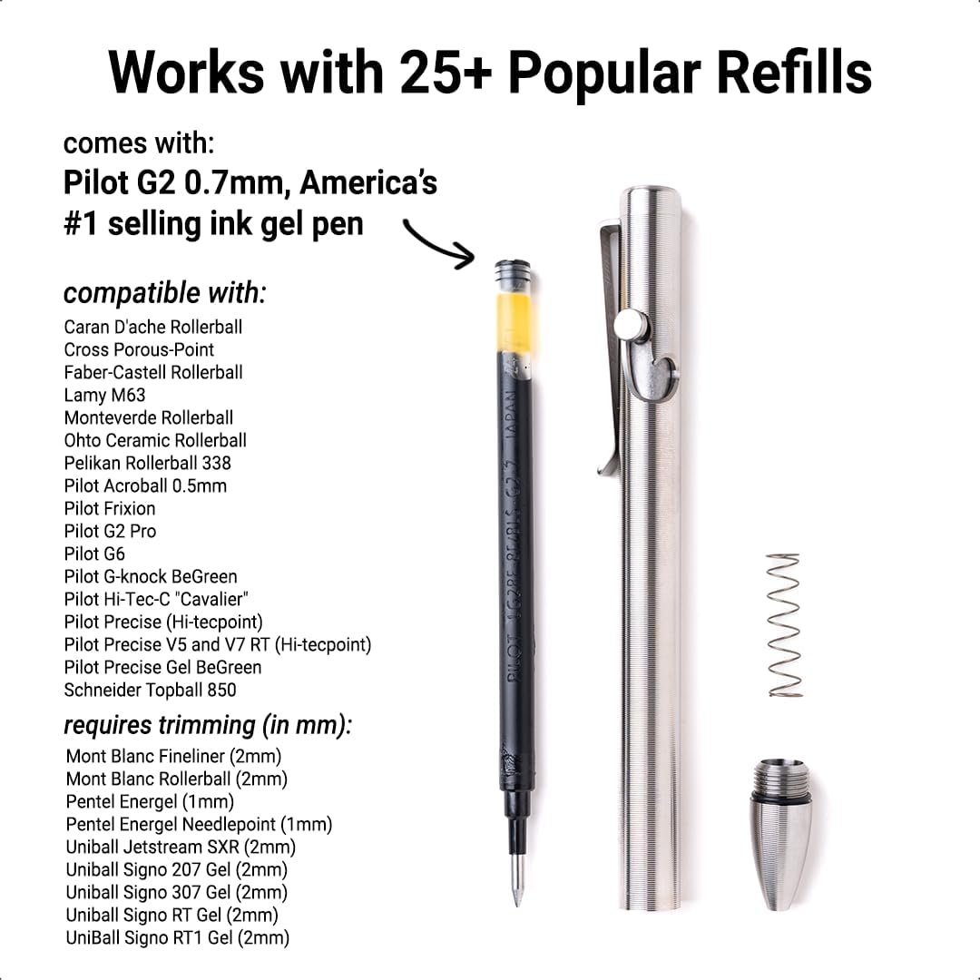 Broad Ink Refill Compatibility. Standard size pens come with the Pilot G2 0.7mm refill, which is America’s #1 selling ink for gel pens. If you’re interested in trying new refills, you can pick from dozens of refills across the most popular brands. Customers especially love the flexibility to use different refill types in particular colors.