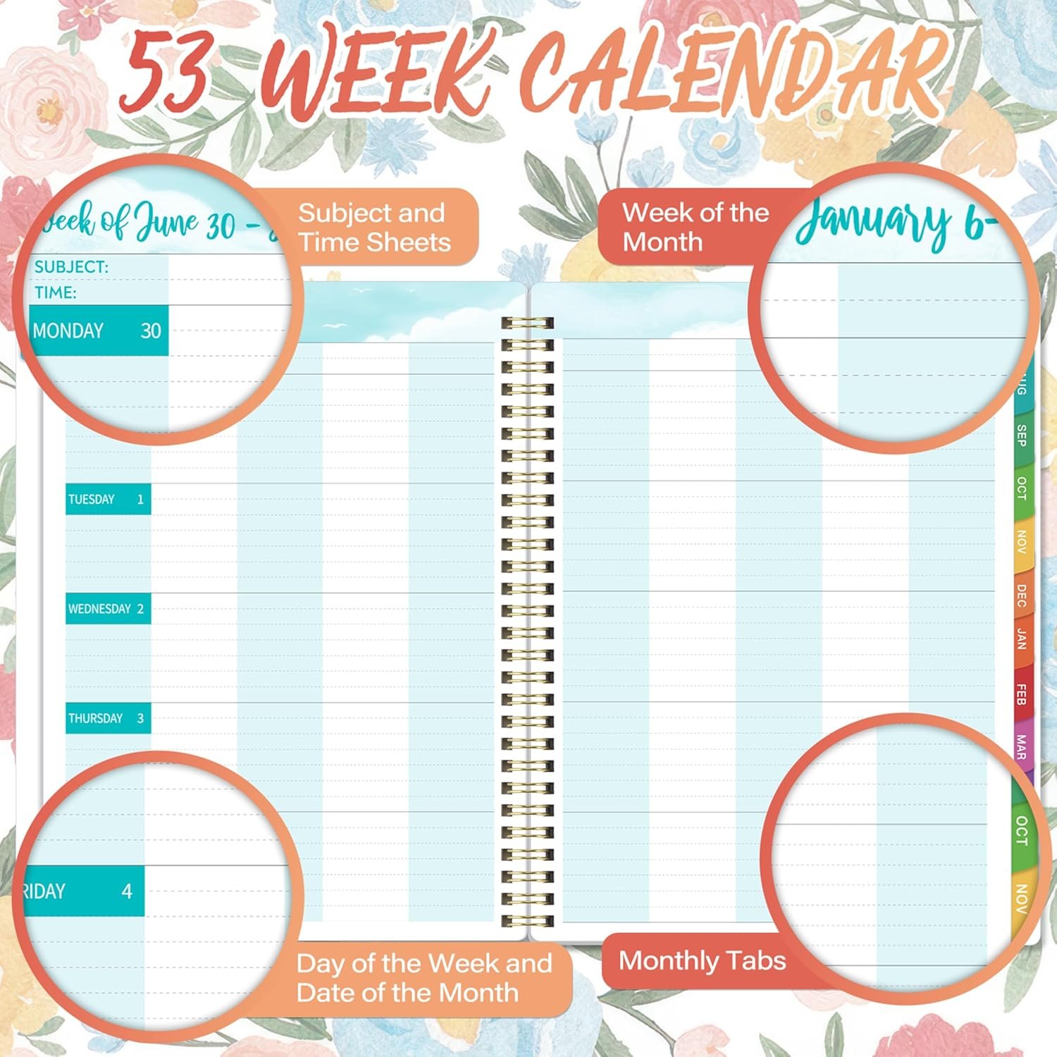 Subject and time sheetsWeek of the monthLarge writing spaceSticky monthly tabsDay of the week and date of the month