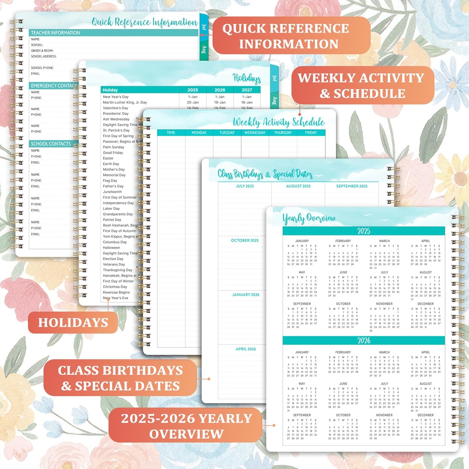 Functional Features – 8” x 10” Weekly and Monthly Planning Pages + Weekly Activity Schedule + Class Birthday & Special Dates + 2025-2026 Yearly Overview + 2025-2027 Holidays + Subject and Time Sheets + Large writing space + Printed monthly tabs