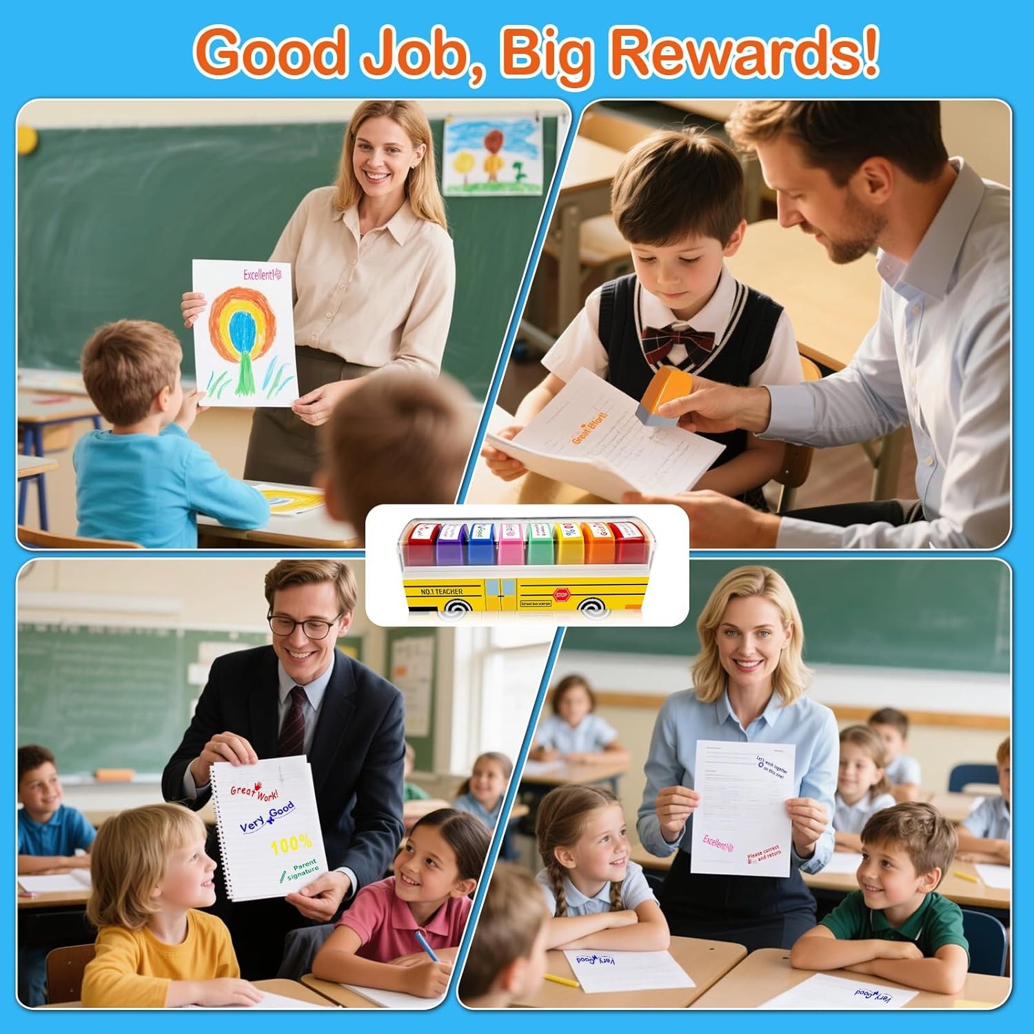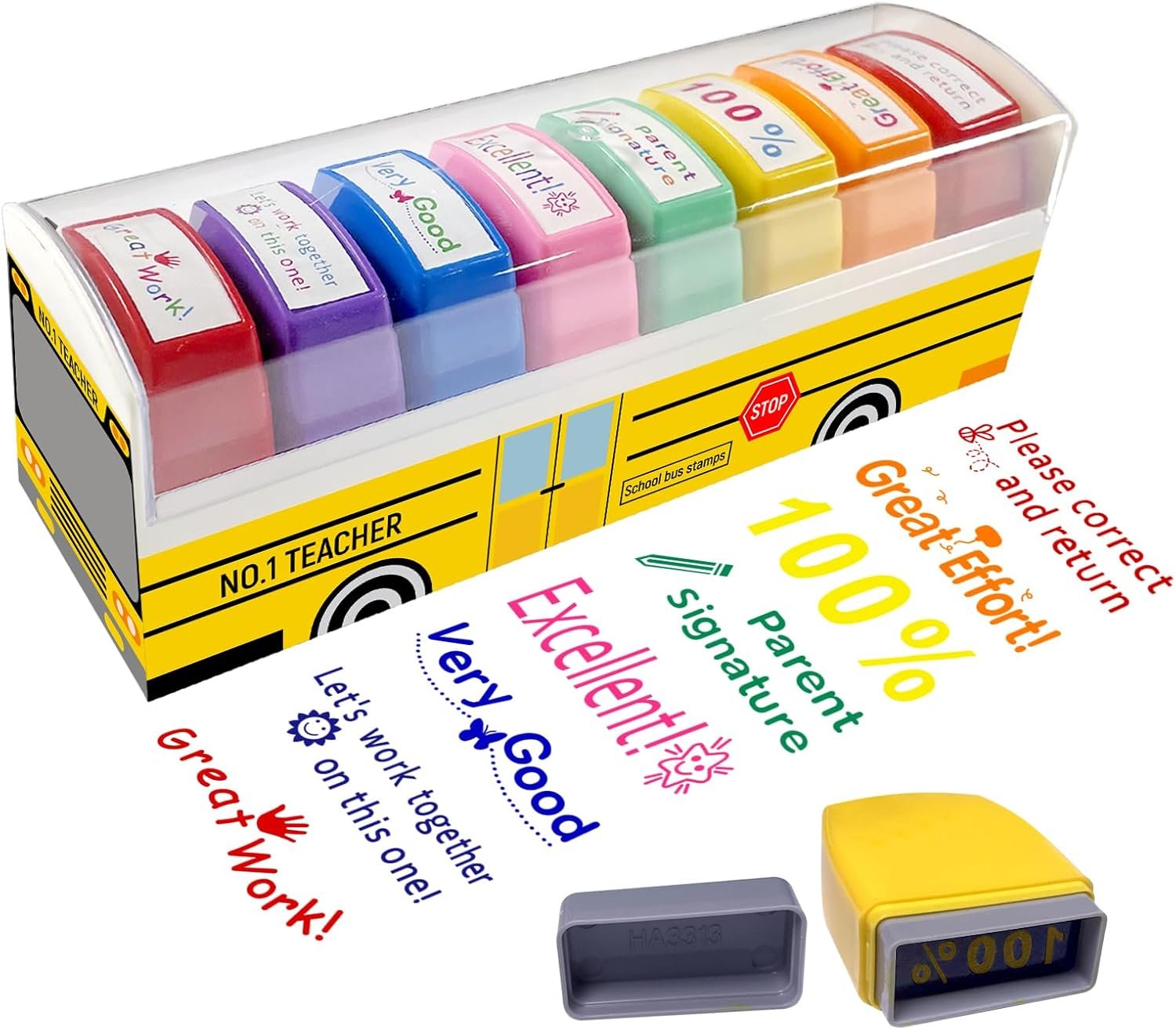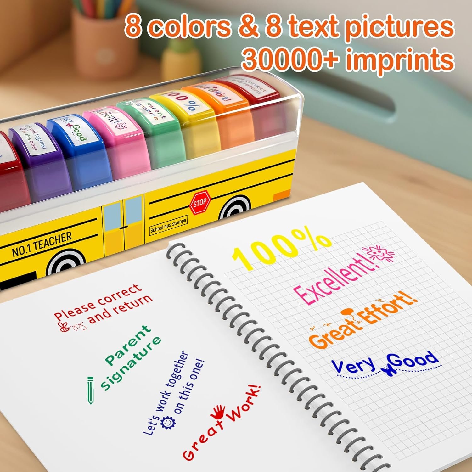 【ADORABLE SCHOOL BUS DESIGN — EXCLUSIVE LOOK FOR TEACHERS】Unlike common round or square stamp sets, our teacher stamps come in a fun, school bus-shaped tray that brings instant classroom charm! Kids love the bright yellow bus, and teachers appreciate the themed organization—it’s a perfect mix of functionality and fun.