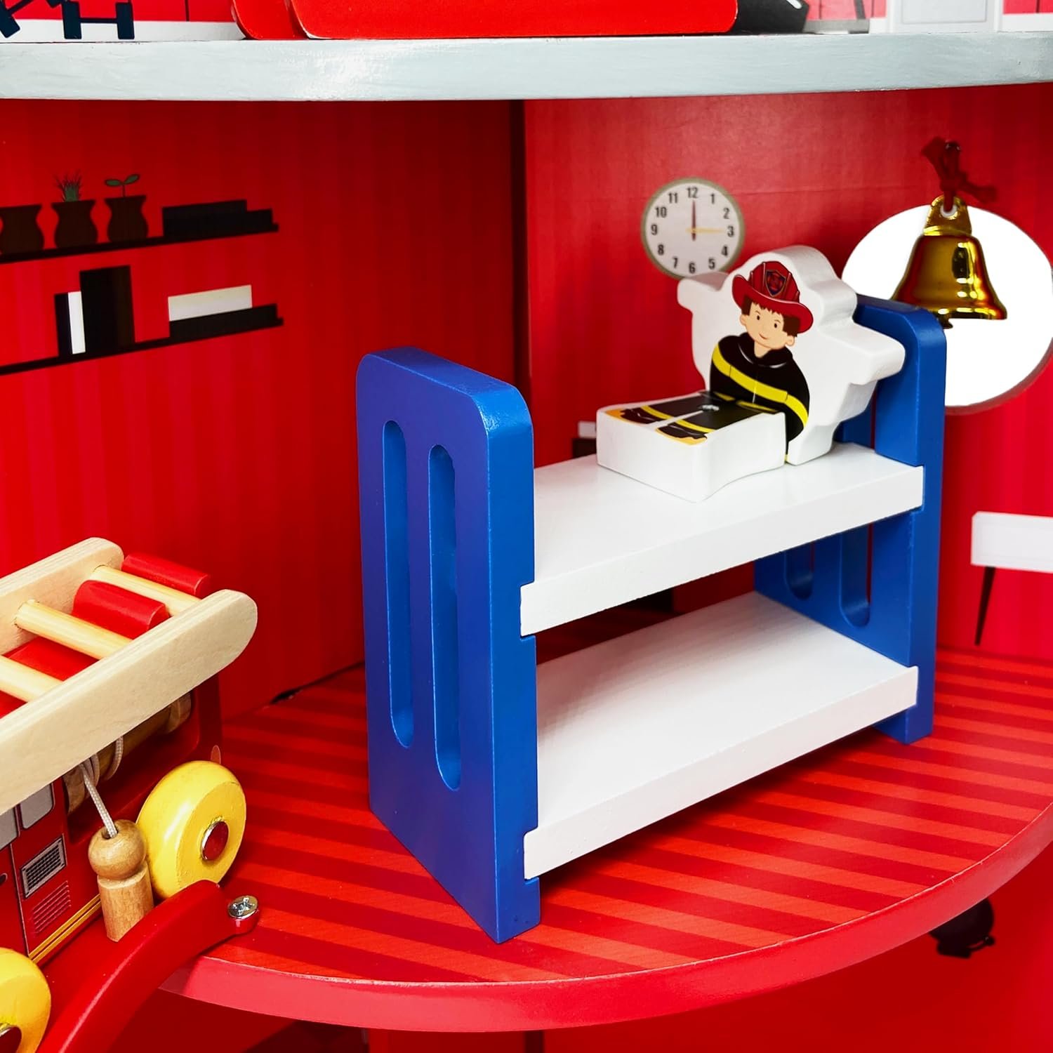 Hydrant-shaped firehouse on a rotating base with a sliding pole, winding slide, a ladder, helicopter, fire truck and a command vehicle