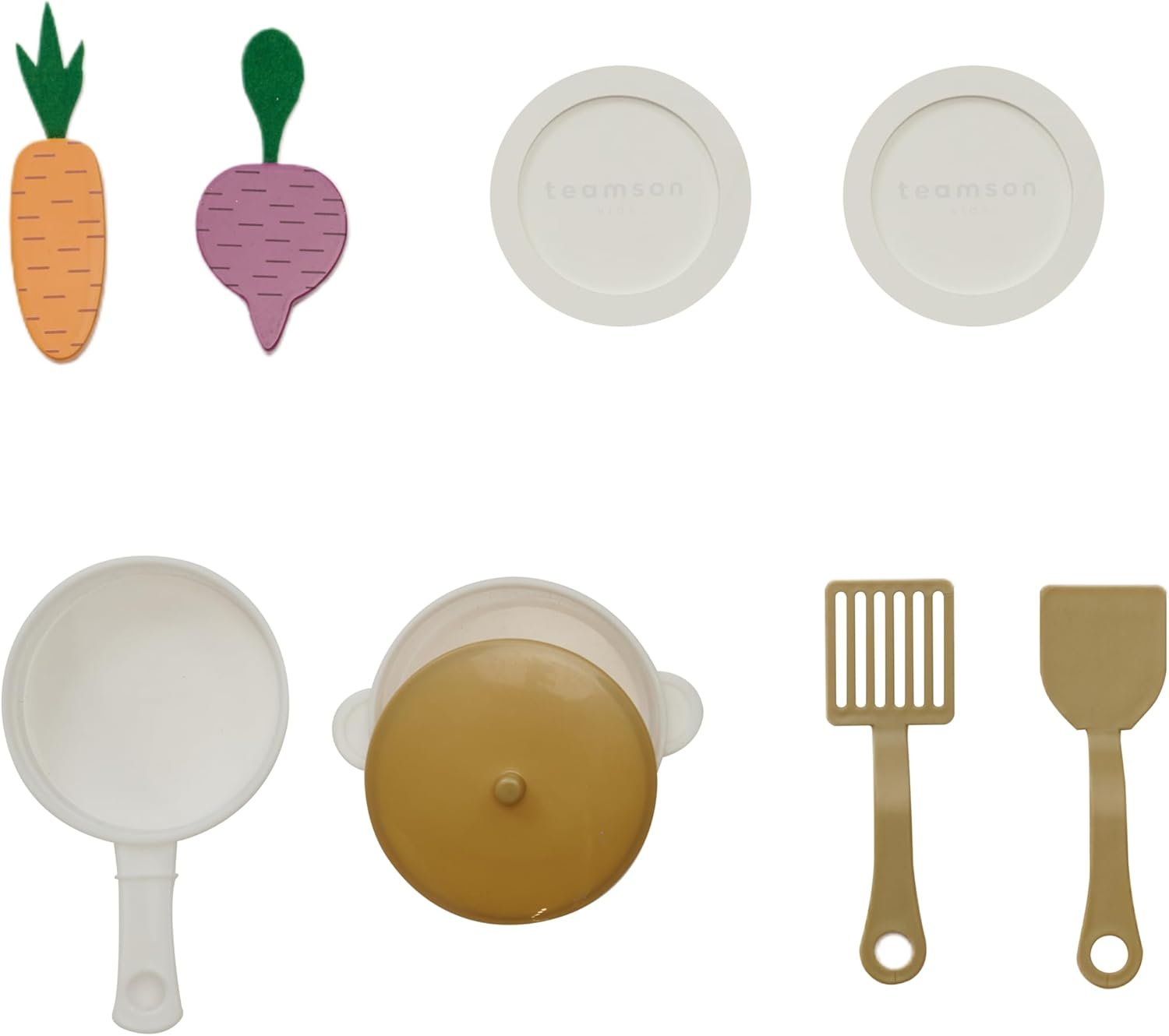 COMPLETE PLAYSET WITH ACCESSORIES Includes 1 pot, 1 pan with lid, 2 spatulas, 2 vegetables, and 2 plates—everything toddlers need to start playing right away.