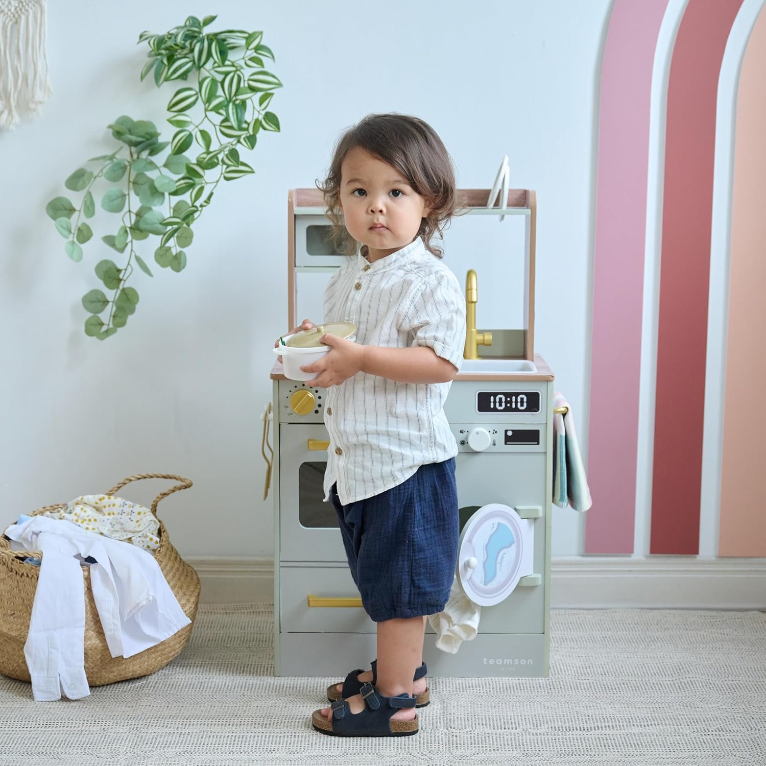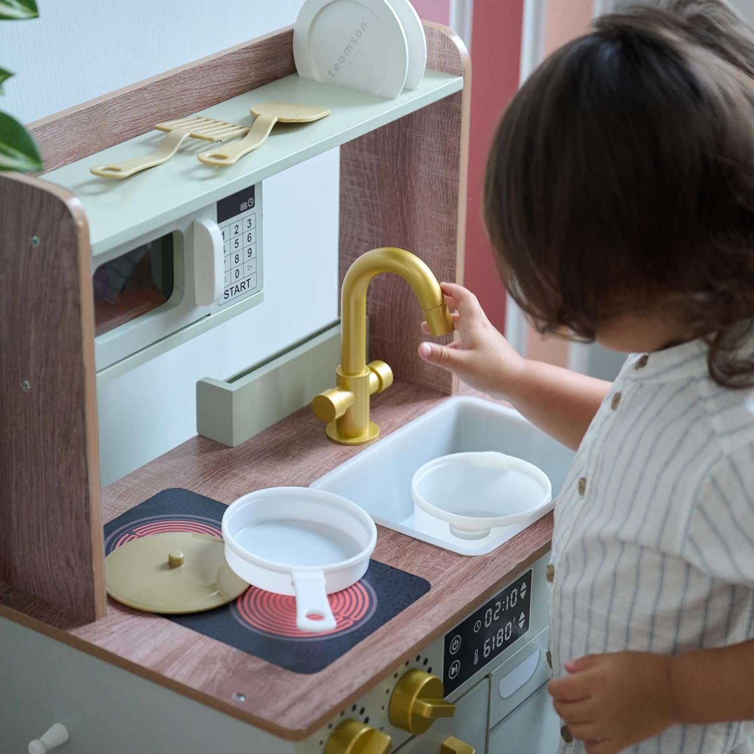 ALL-IN-ONE PRETEND PLAY EXPERIENCE Features a microwave, oven, stovetop, sink, washer, towel and plate racks, hooks, and even a mini garden—encouraging imaginative multitasking fun.