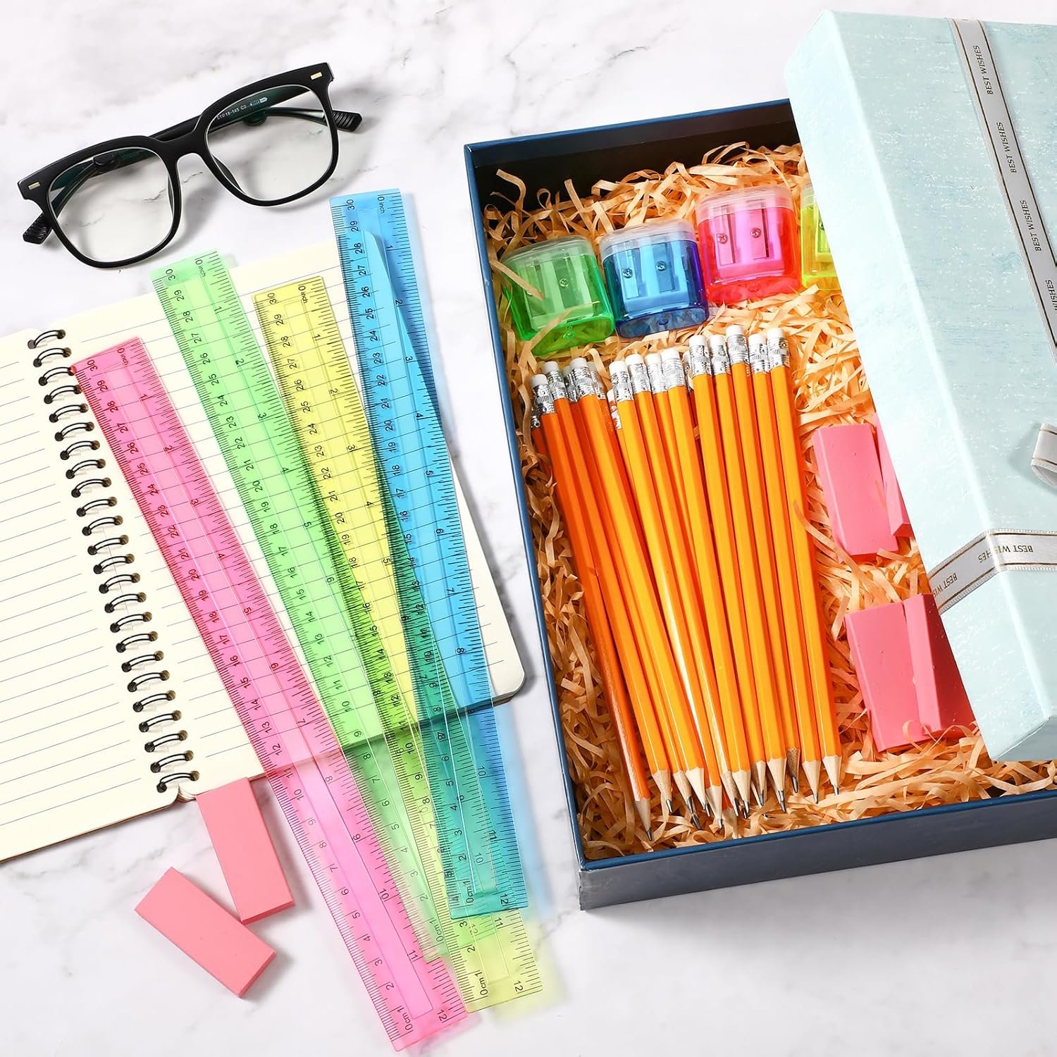 Rich Stationery Set: the set contains 60 pre sharpened pencils, 30 double hole pencil sharpeners with covers, 30 rulers, and 30 pink erasers, which are brightly colored and sufficient in quantity to meet your needs