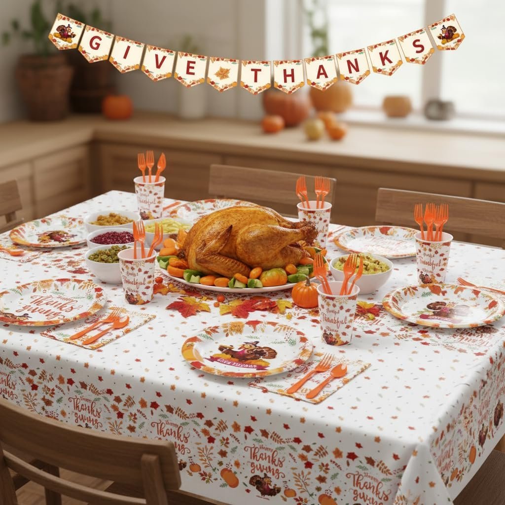 ·2025 THANKSGIVING TURKEY PARTY SUPPLIES DINNERWARE SET: Includes 127 PCS for 25 Guest –25 x 9 inches disposable paper dinner plates, 25 x 7 inches compostable dessert plates, 25 x 9oz paper cups, 25 x 6.5”paper napkins,25 gold plastic forks, 1 pcs tablecolth and 1 pcs banner. Durable Party Supplies set allow you to serve 25 guests at one time.