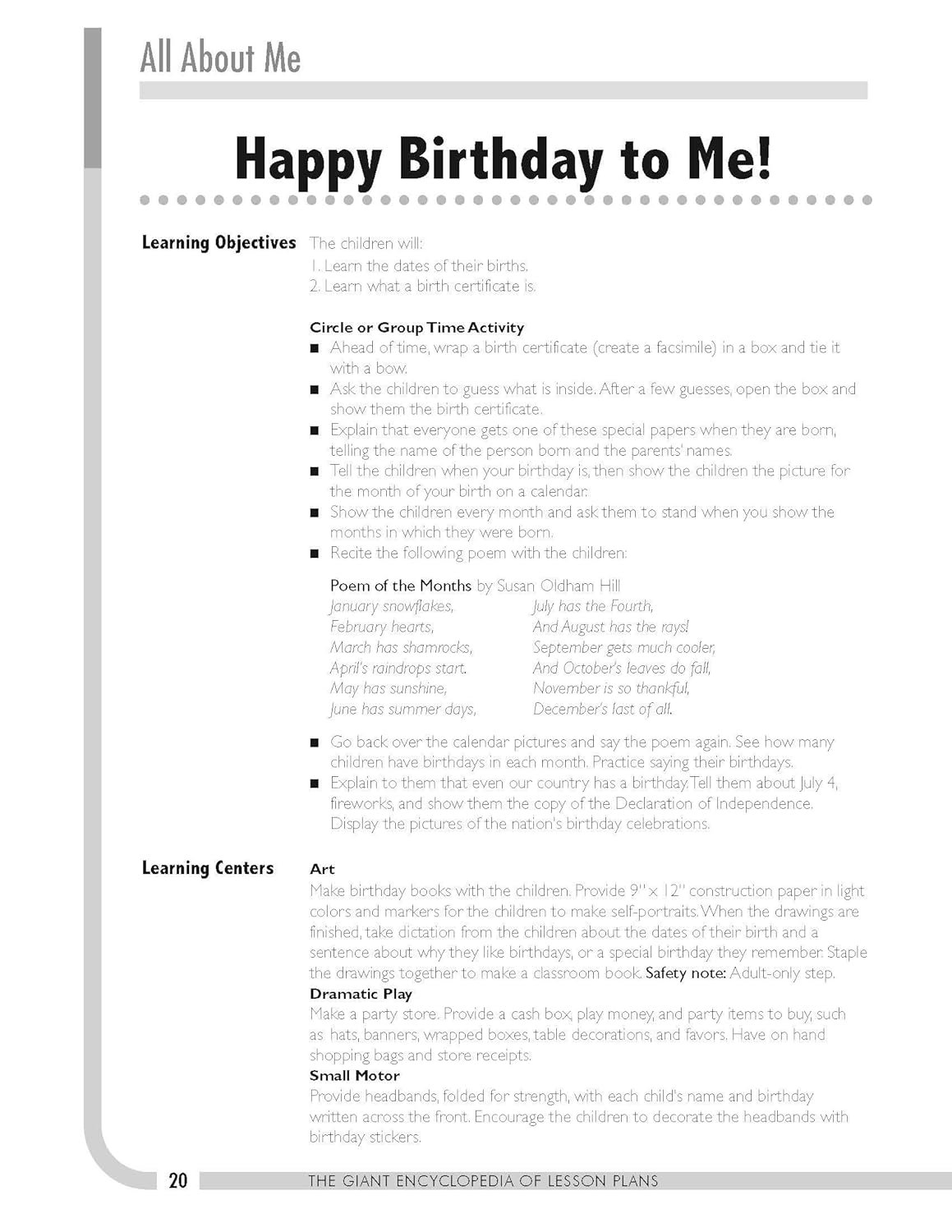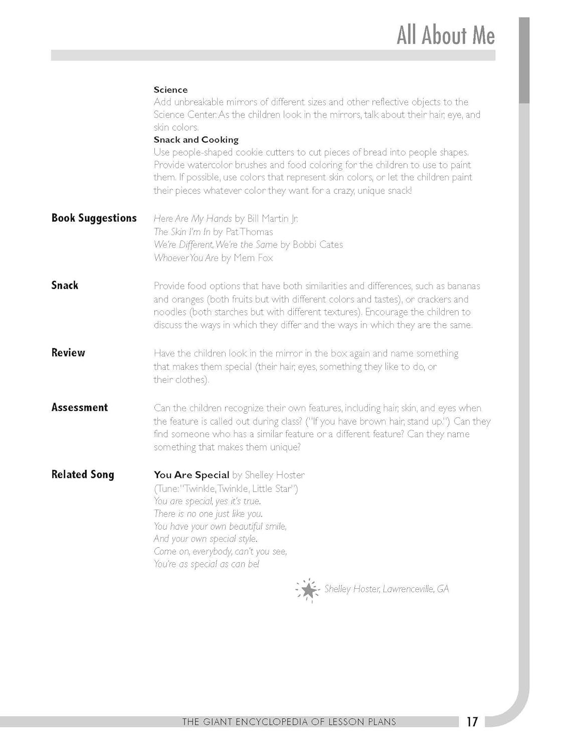 Learning Objectives A Circle or Group Time Activity Book Suggestions Snack Ideas Five Learning Center Activities Assessment Strategies Related Songs, Poems, and Fingerplays