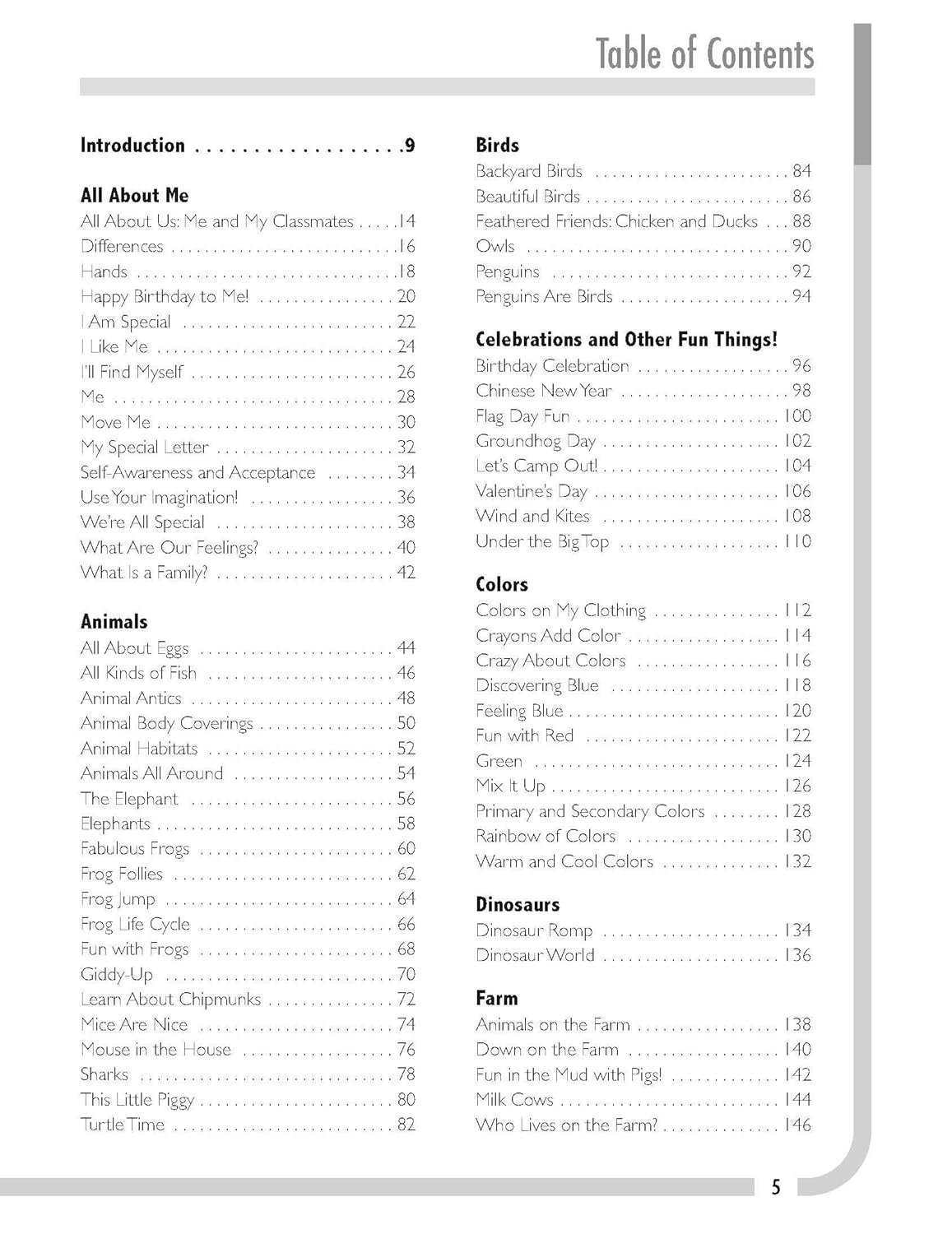 Make early childhood education easy and effective with preschool learning activities designed for intellectual stimulation to support children’s educational development and set them up for elementary school success. This educational preschool activity guide includes a variety of early learning topics such as Animals, Birds, Celebrations, Colors, Food, Health and Safety, Literacy, Numbers, Seasons, Senses, Shapes, and Weather.