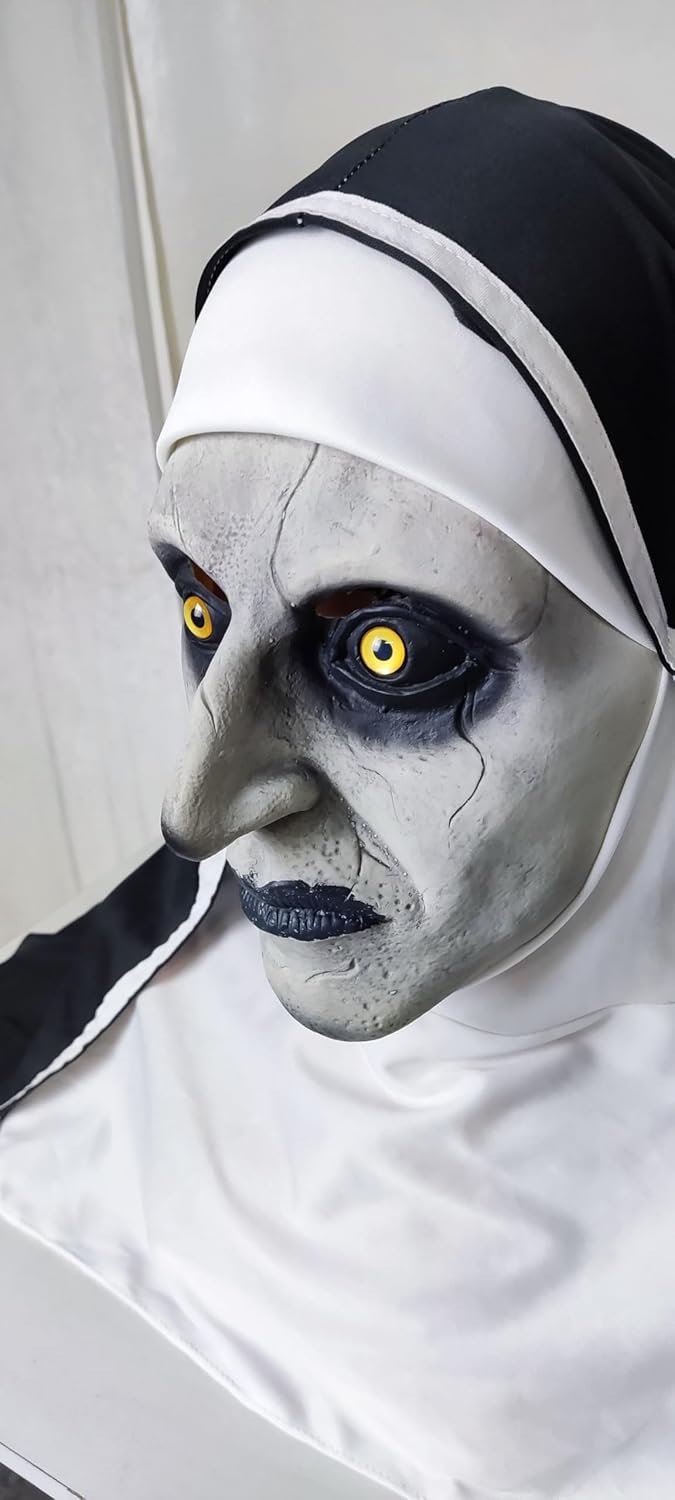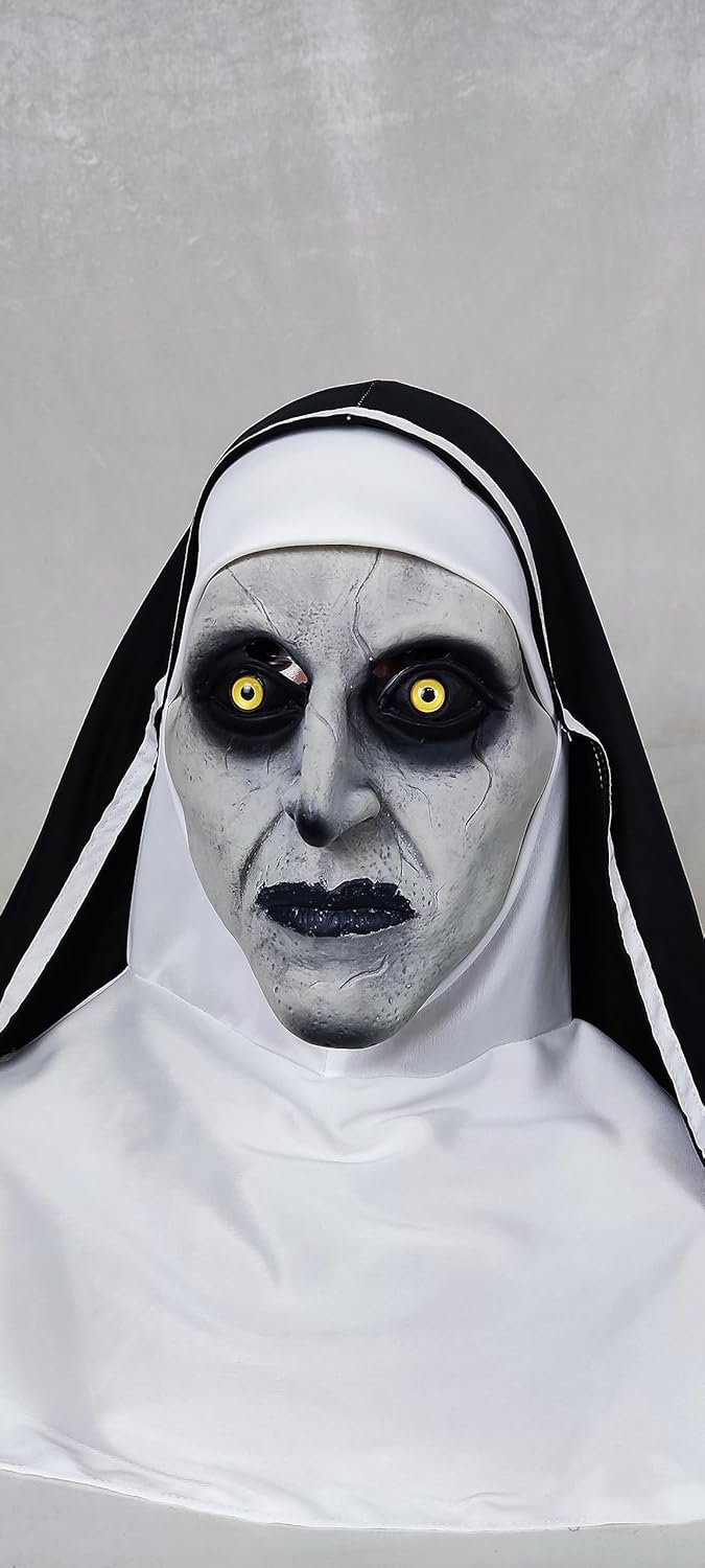 【The Nun mask】The Nun Mask is the nightmarish image of the evil Nun with his white face,Empty eyes, and Eyebags as dark as night and black lips,Give people a chilling feeling.