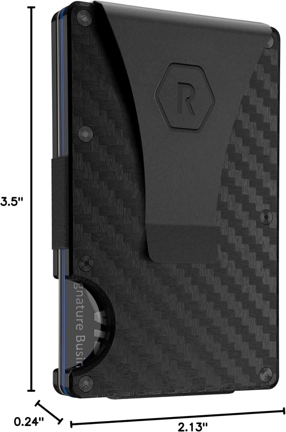 RFID-blocking materials – 6061-T6 aluminum | anodized carbon fiber plates – 2 oz | 86 x 54 x 6 mm frame – Interchangeable elastic and screws.