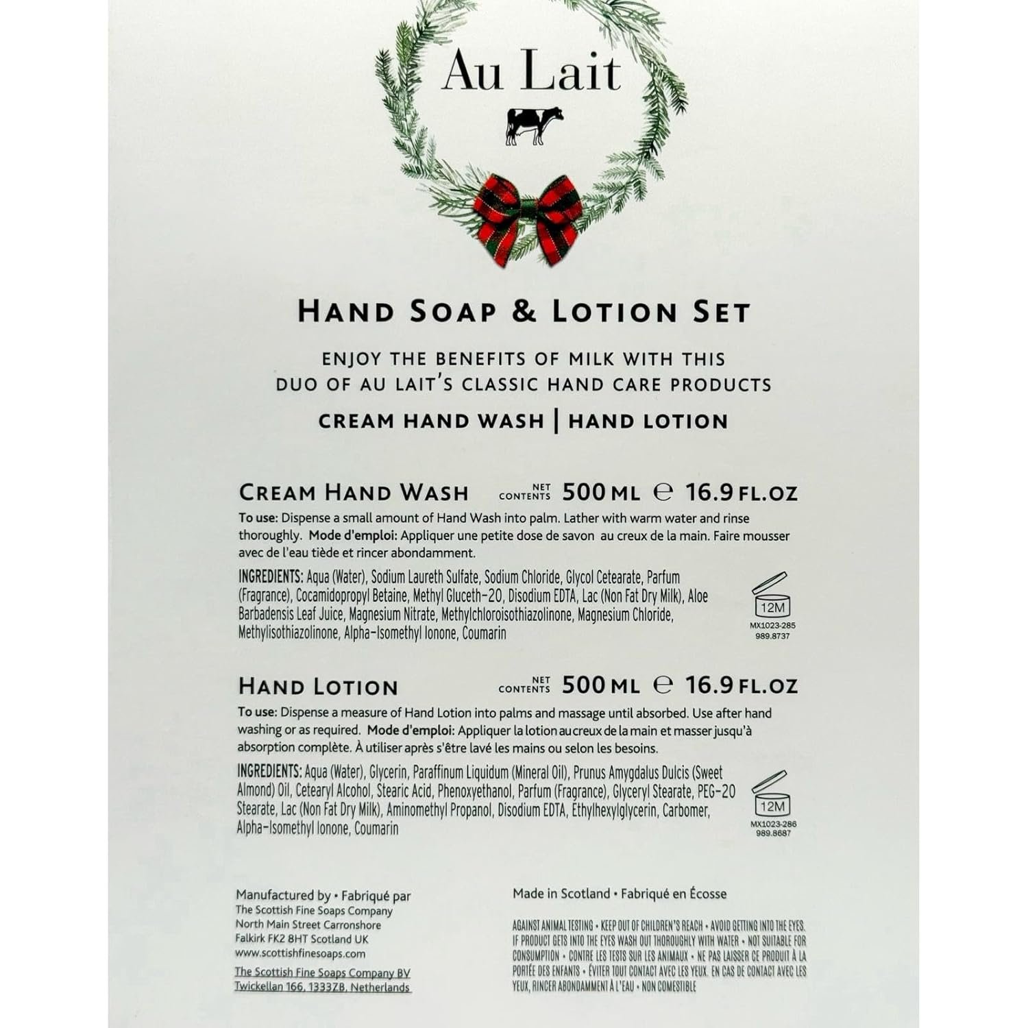 Indulge your hands with the luxurious Au Lait collection from The Scottish Fine Soaps Company. This elegant set includes a 17.5oz hand wash and matching 17.5oz hand lotion, both featuring sophisticated pump dispensers with chrome accents. The pristine white bottles showcase minimalist design with subtle branding and a charming cow motif, reflecting the milk-inspired formulation. The generous 500ml size makes these perfect for busy bathrooms or kitchens where frequent hand washing occurs. The coordinating wash and lotion duo allows you to maintain both cleanliness and moisture throughout your daily routine. The sleek packaging adds a touch of refinement to any sink area while providing practical, everyday luxury for your hand care needs.