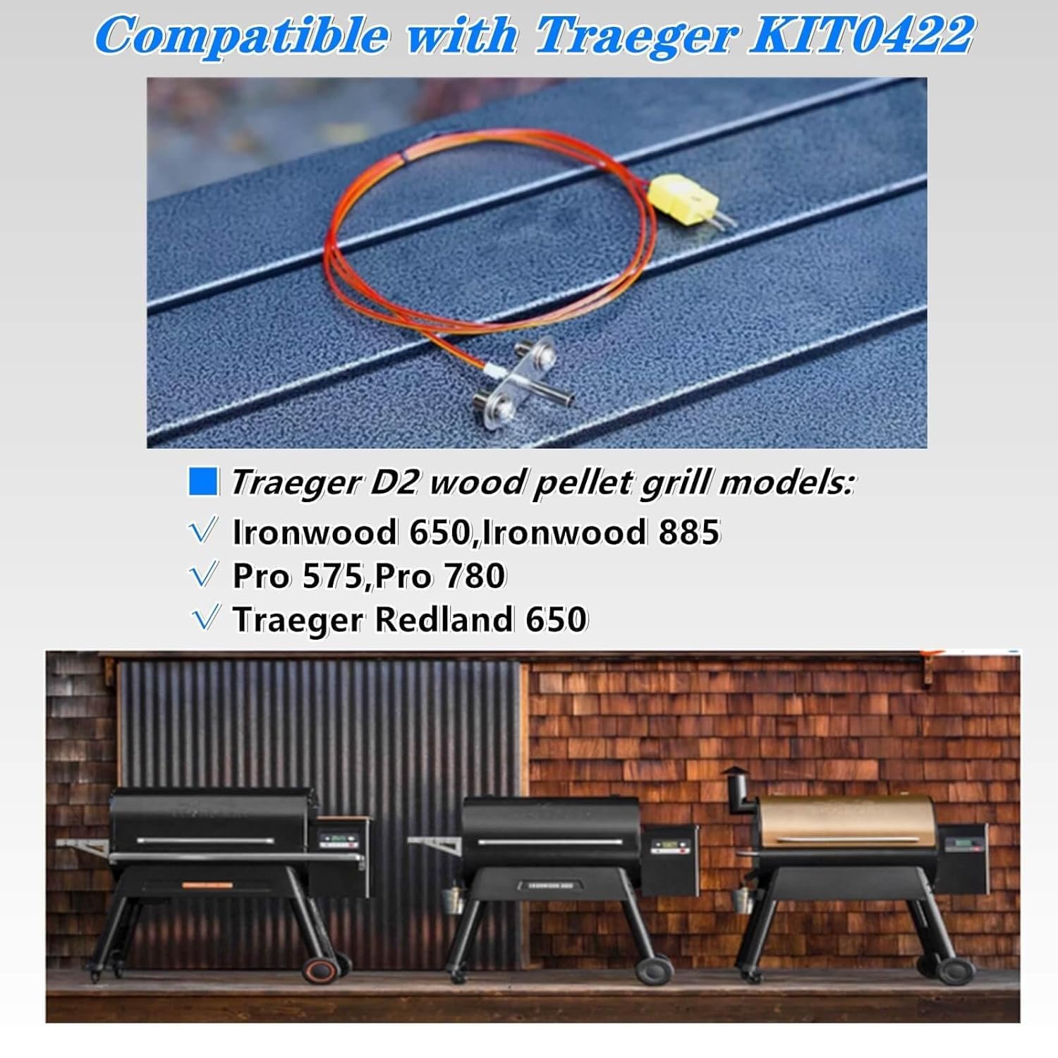 Compatible With: This Thermocouple Probe Kit is compatible with Traeger D2 Pro 575 & 780 and Ironwood 650 & 885 wood pellet grills, including the Traeger Redland 650.