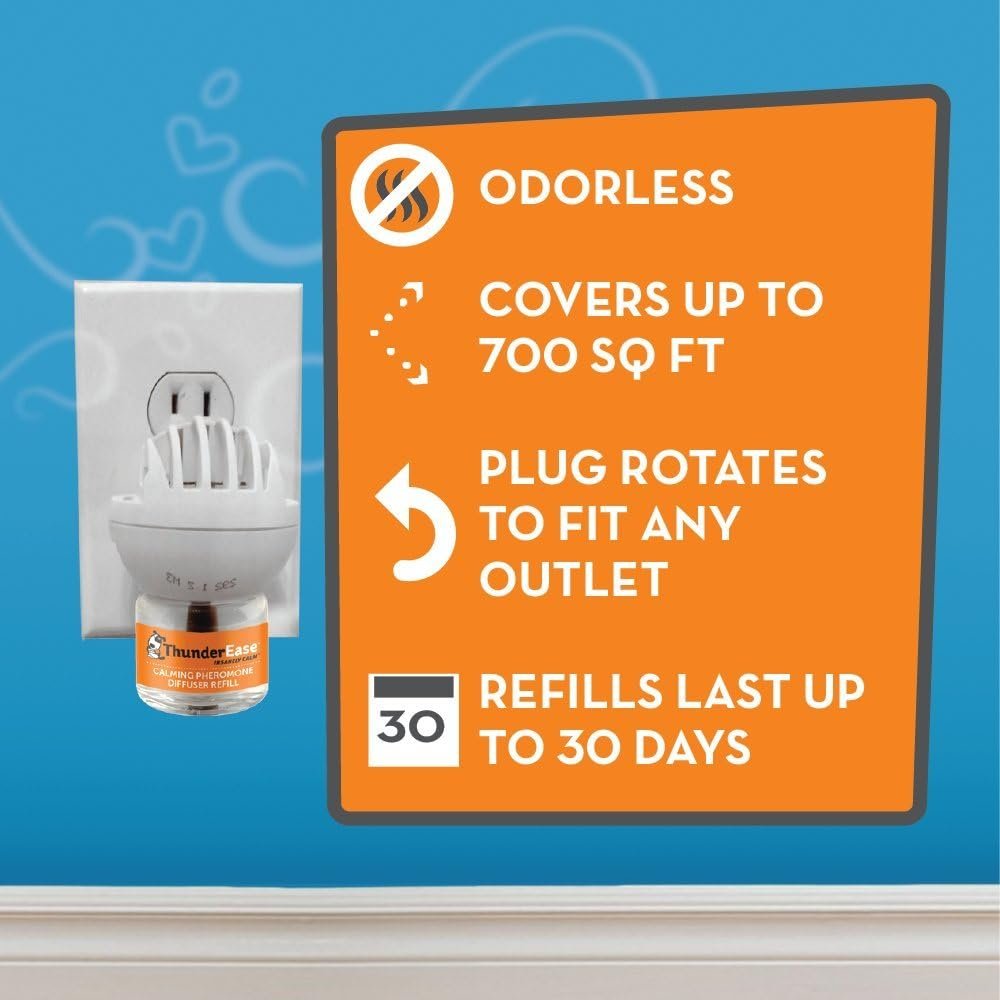The diffuser continuously releases a calming pheromone analog for up to 30 days, to help comfort your pet at home. Simply plug into an open outlet with at least 4 feet of space to diffuse, with vents pointed upright.